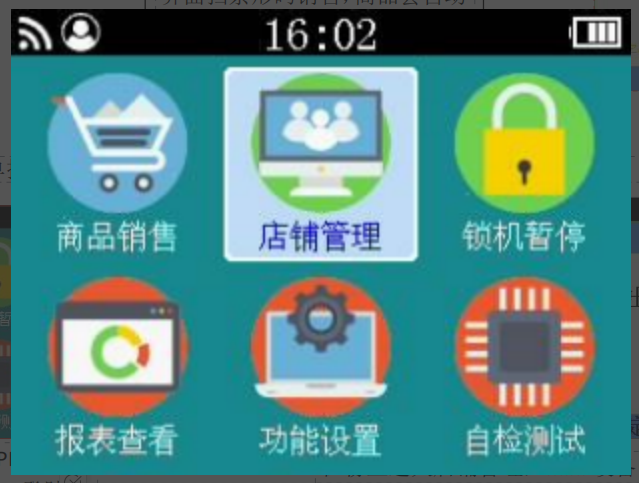 1, 在miniPOS管理菜单按【上翻】【下翻】选择【店铺管理】