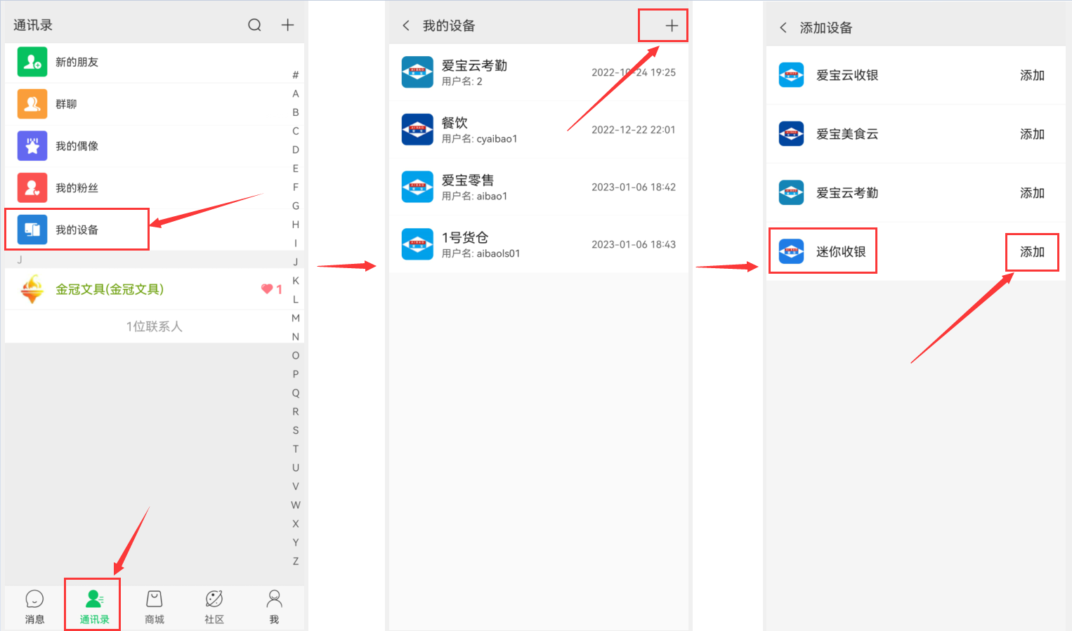 5, 在粉丝达人APP --> 通讯录 --> 我的设备 --> 添加设备 --> 添加迷你收银,打开摄像头扫二维码