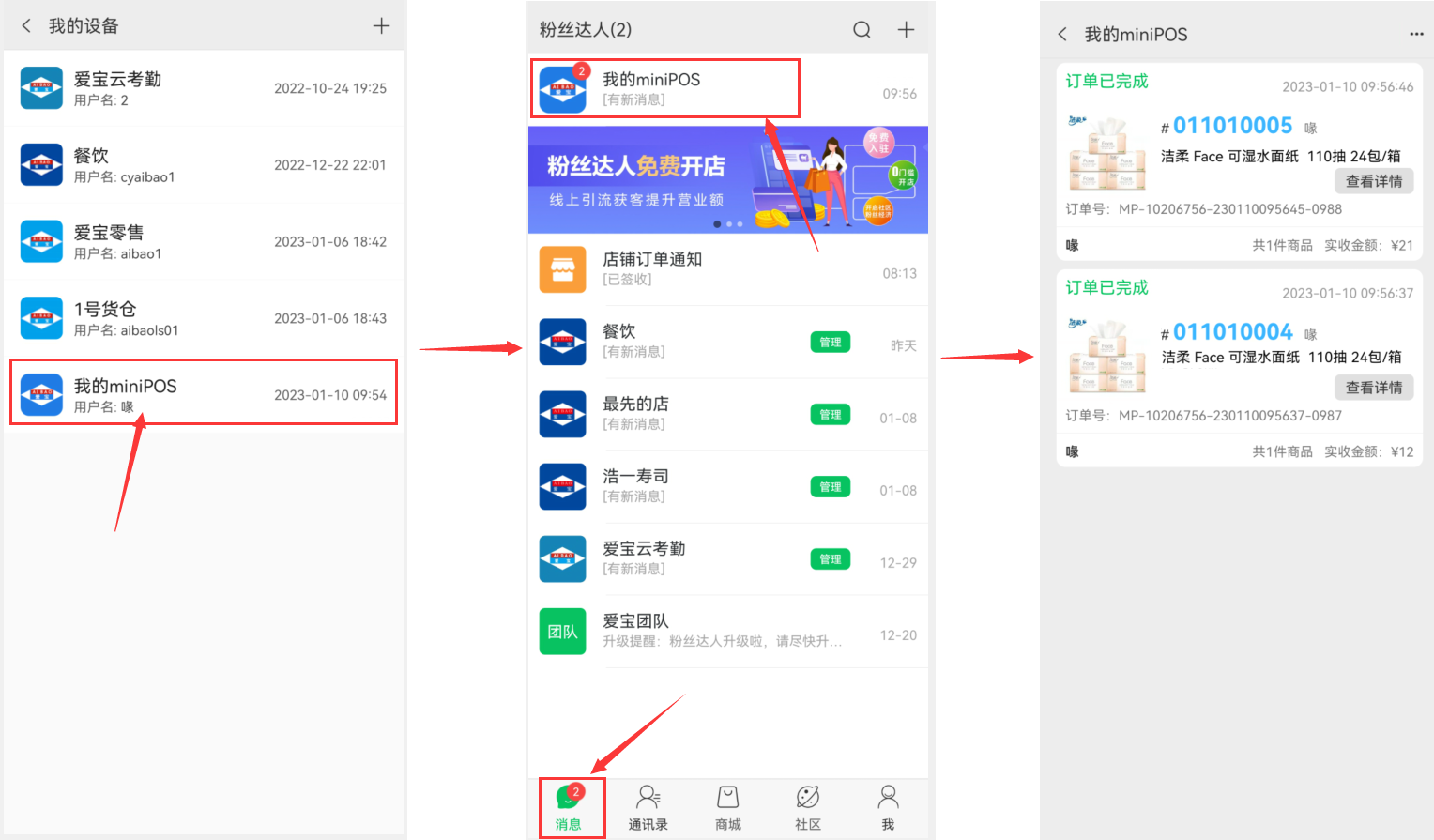 6, 粉丝达人绑定miniPOS成功,在miniPOS下订单,粉丝达人就可以收到订单消息了