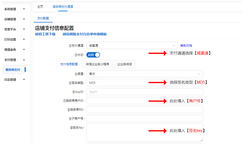 威富通所需参数 : mch_id(门店编号)、signKey(签名key)
