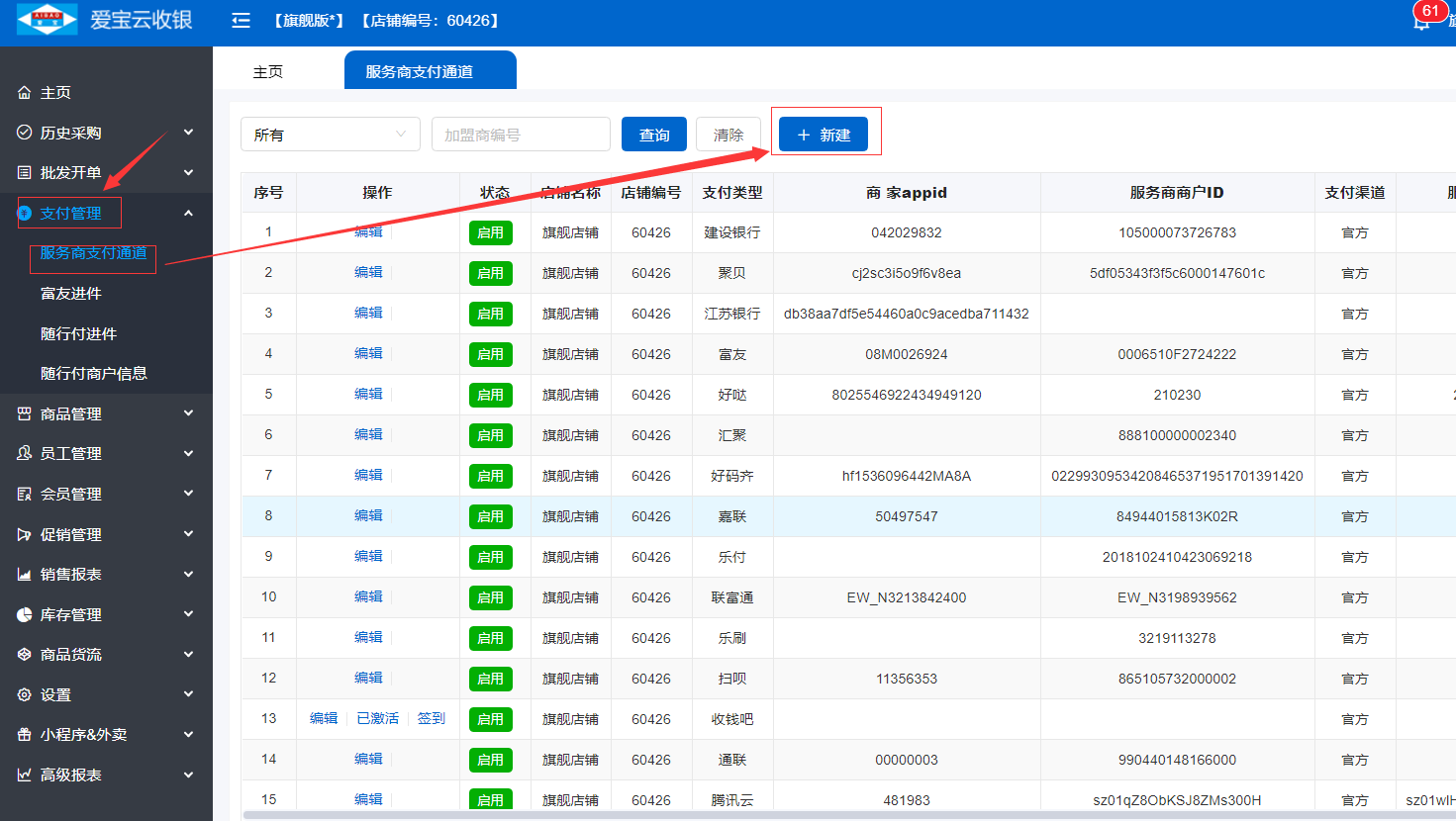 2.在后台【支付管理】-->选择【服务商支付通道】-->点击【新建】,如图所示: