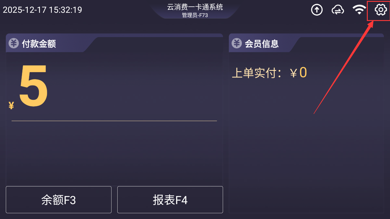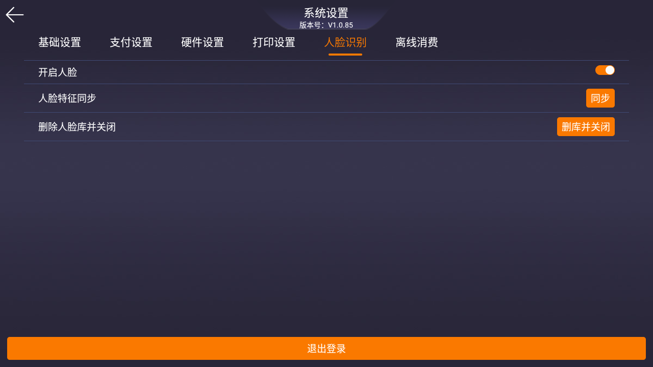 点击主页面右上角的齿轮设置按钮(图6),输入密码点击【确定】(图7),进入设置页面(图8),点击【人脸识别】>开启【开启人脸】>点击【人脸特征同步】,等待数据下载完成(图9),返回到主页面,输入金额,即可使用人脸支付(图10);