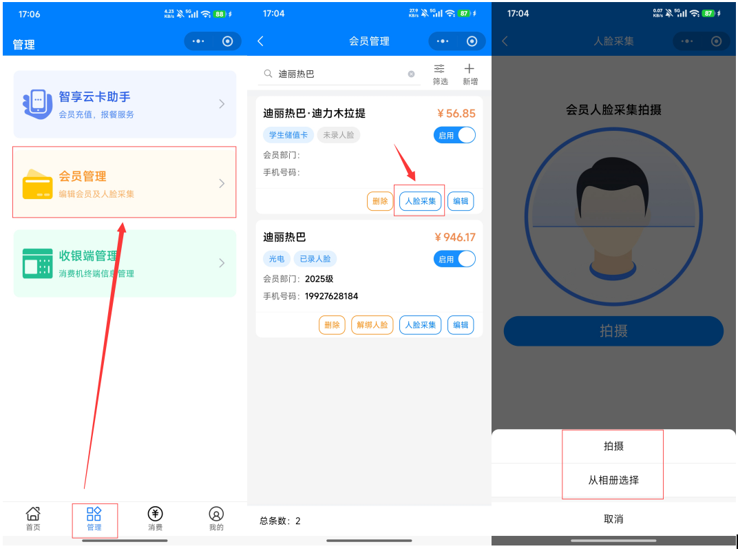 登录智享云卡助手小程序点击管理菜单,进入会员管理页面,选择会员人脸采集按钮,进行拍摄或者从相册选择图片进行录入人脸信息。