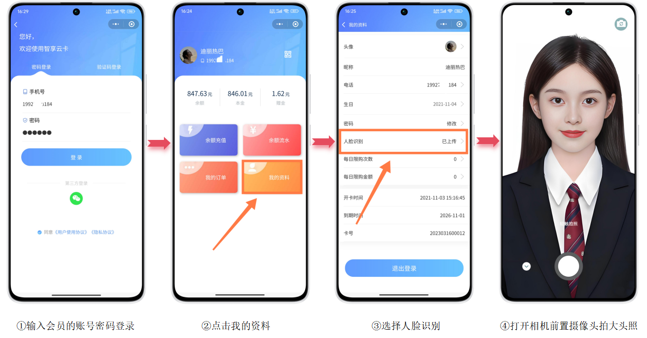 ※操作流程:①输入会员的账号密码登录→②点击我的资料→③选择人脸识别→④打开相机前置摄像头拍大头照
