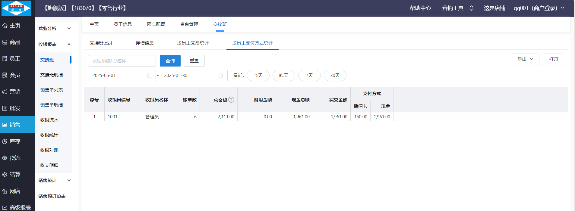 统计收银员在交班期间的单数、总金额、备用金额、现金金额、实际交班金额等信息,支持打印和导出