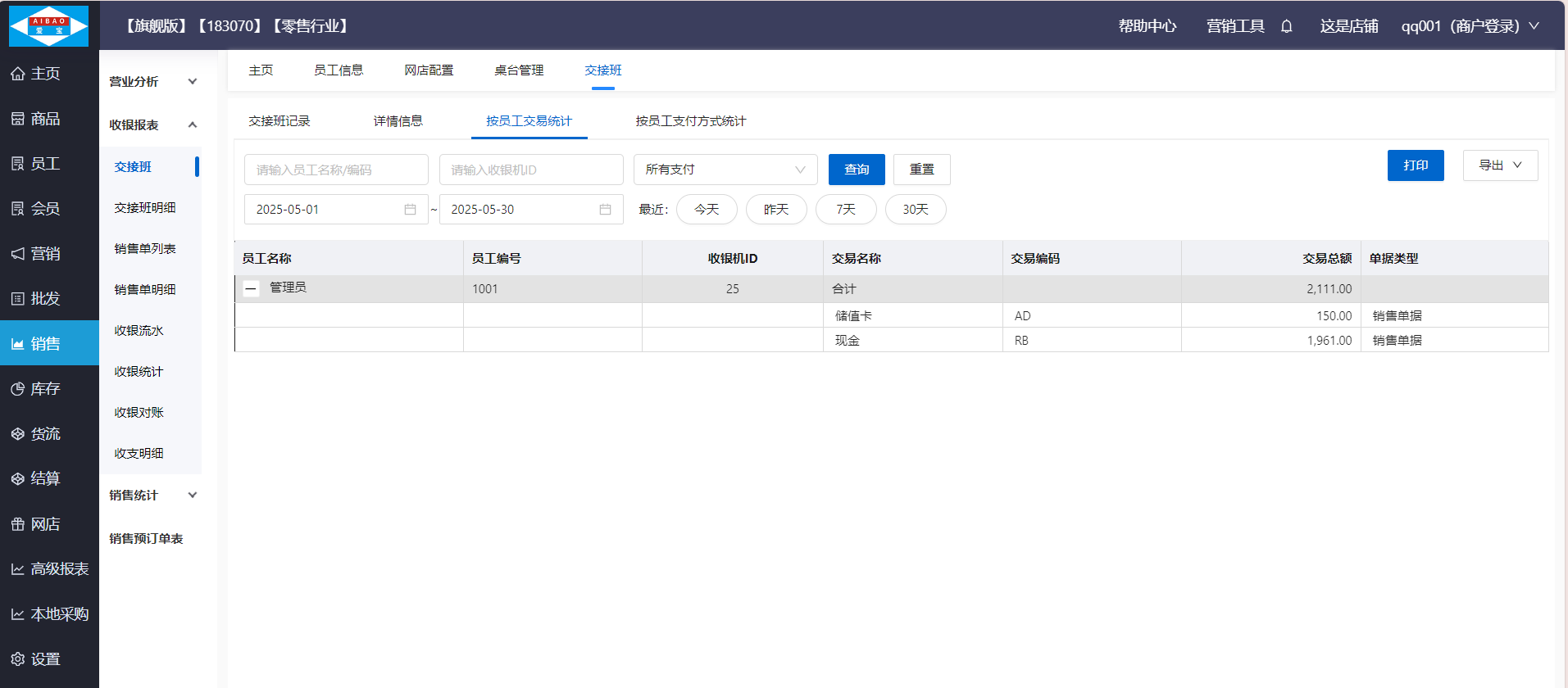 统计各个收银员在每台收银机上的交易总额,展开可以查看各个支付方式的金额,并支持打印和导出