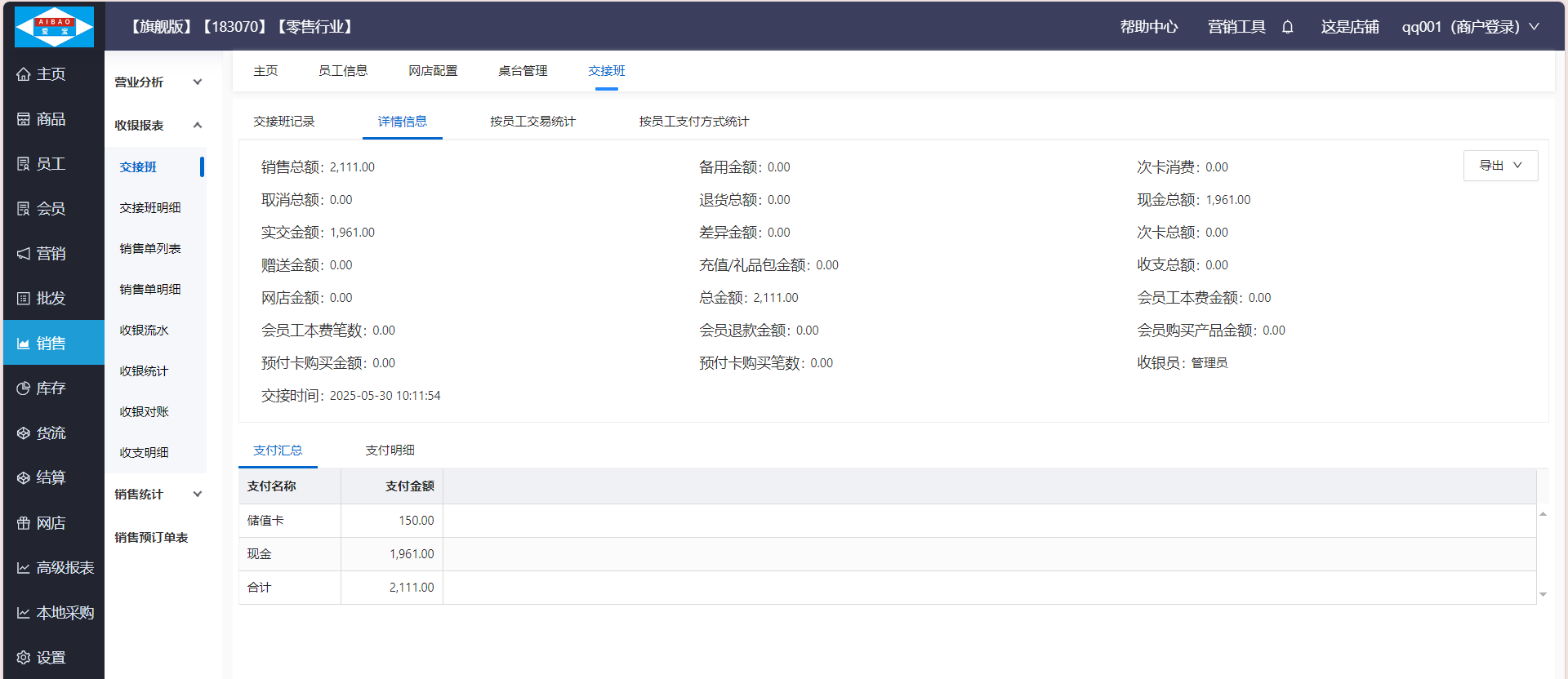交班班,统计收银端员工交班时的信息记录,如员工在上班期间的销售明细、金额和数量,具体商品等信息