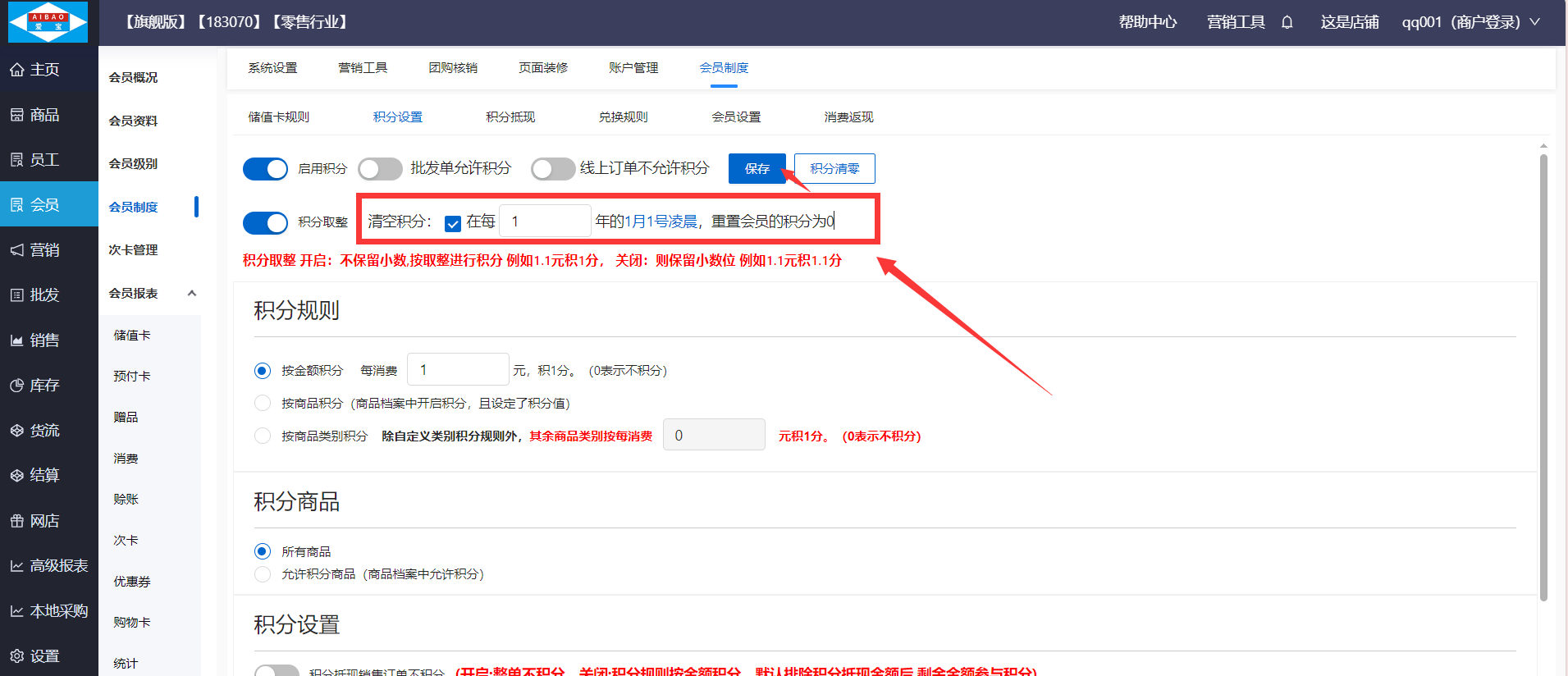 勾选清空积分,选择在每年的1月1号凌晨,重置会员的积分为0