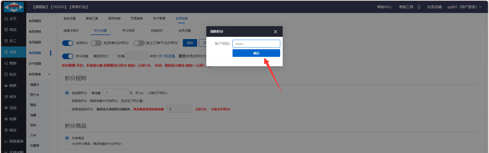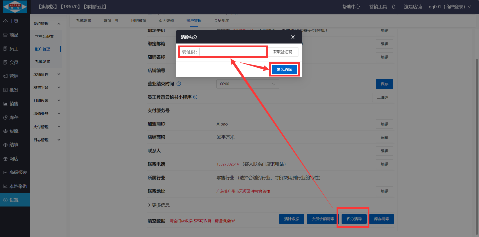 方式2:在【设置】-【系统管理】-【账户管理】-【基本设置】页面,清空数据选择“积分清零”,输入手机验证码后确认清除