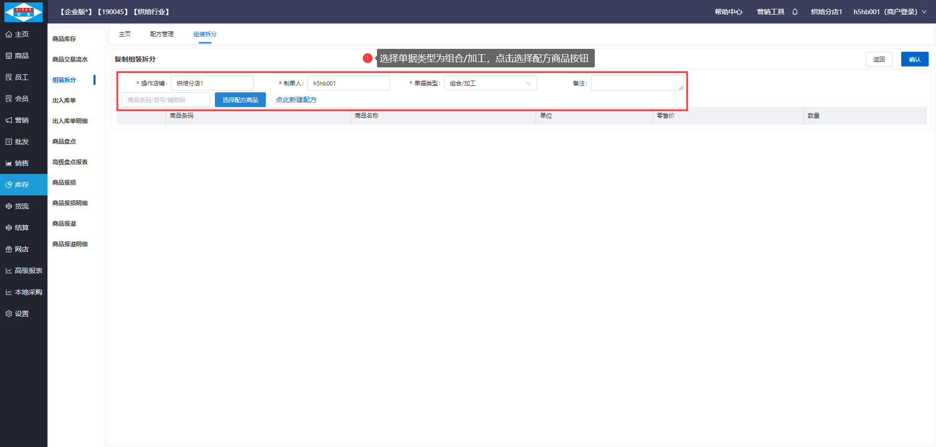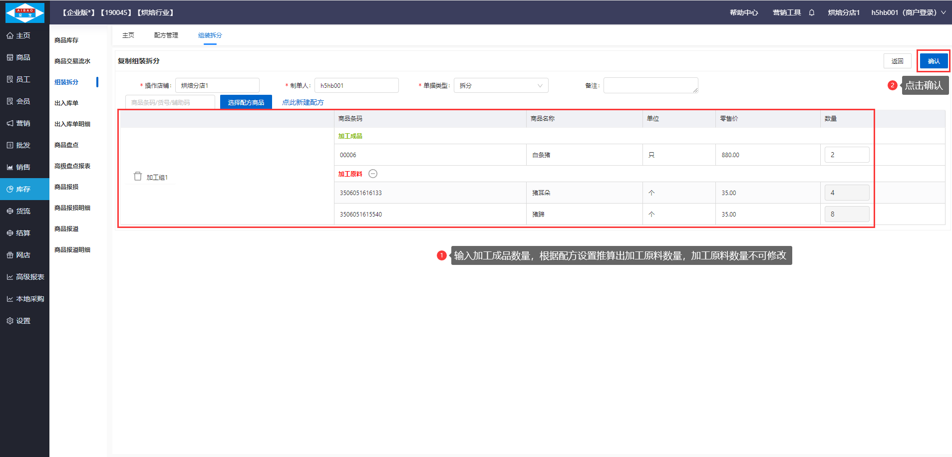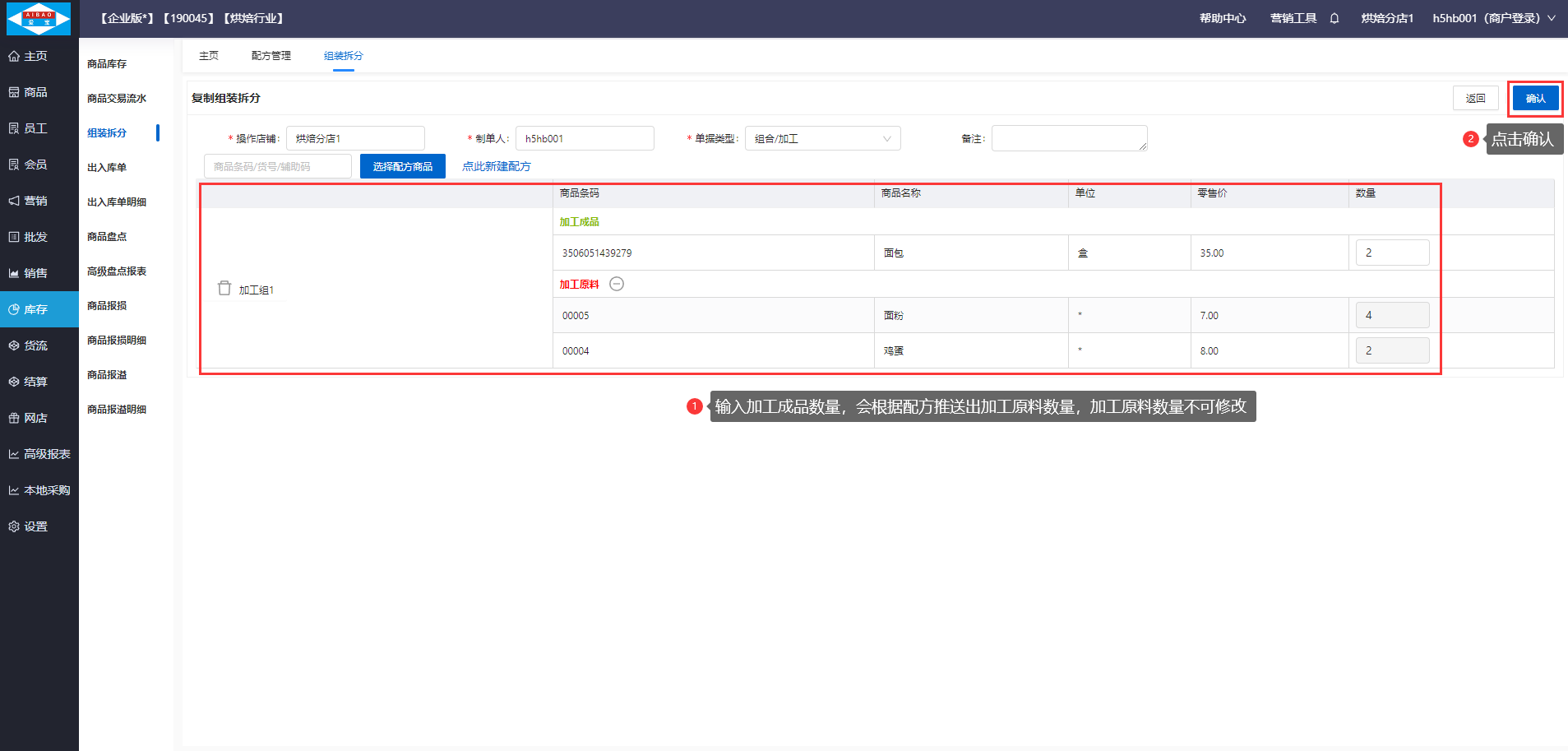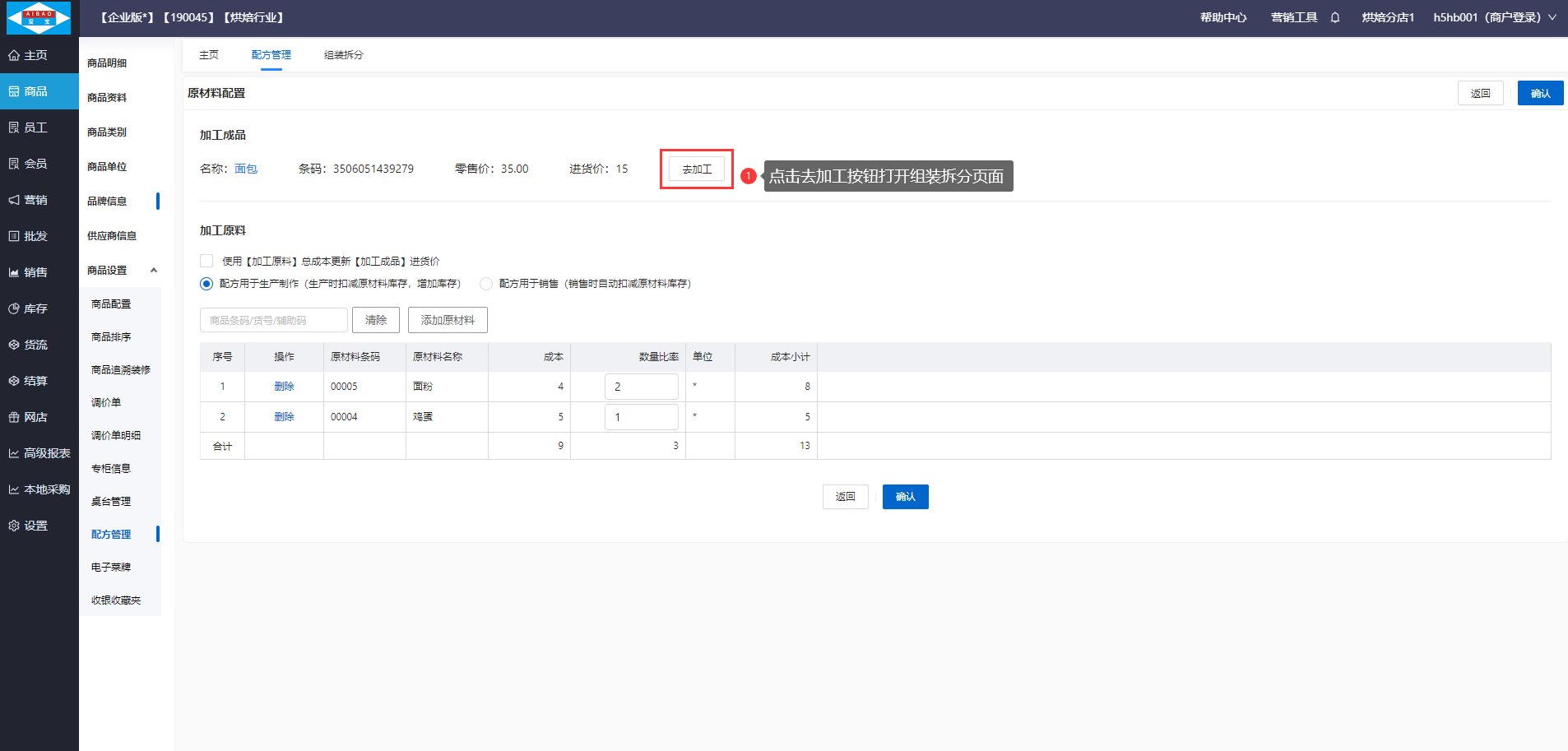 【前置条件】需要在商品资料创建好加工成品:面包,加工原料:面粉、鸡蛋,并已设置加工成品:面包的组装配方。
