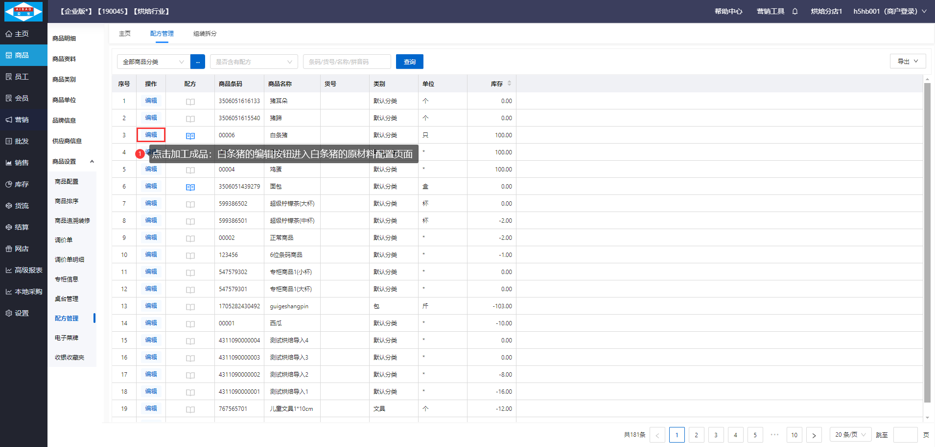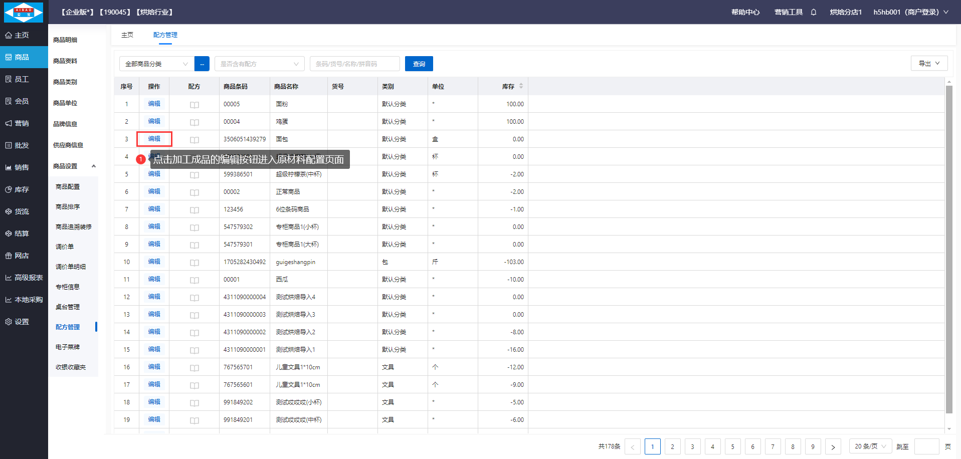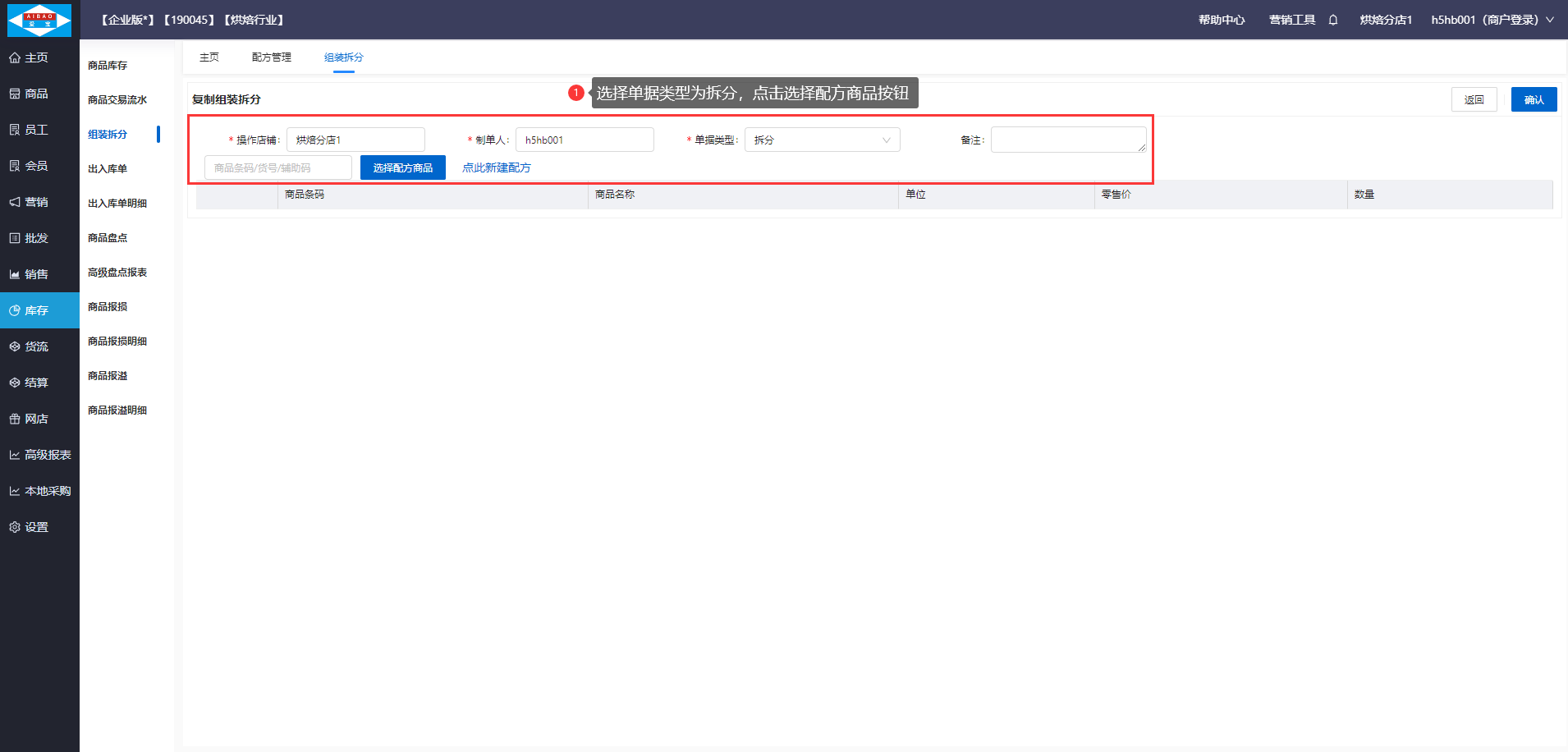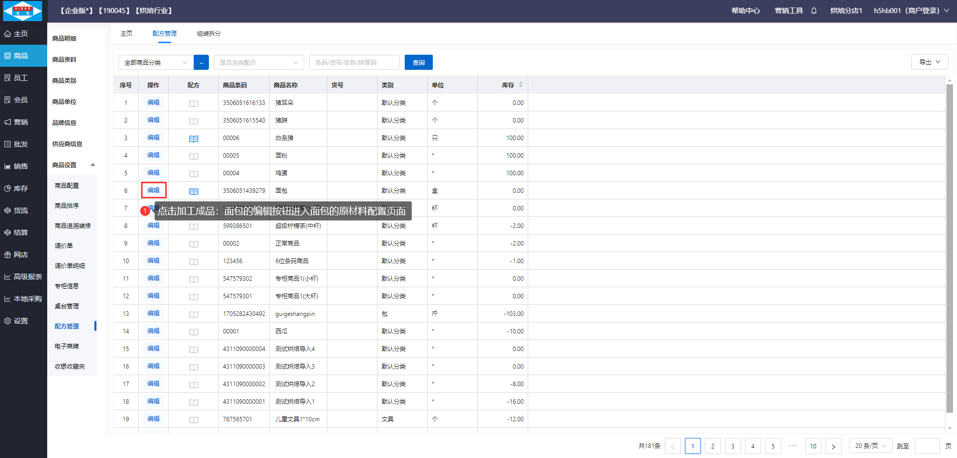 【前置条件】需要在商品资料创建好加工成品:面包,加工原料:面粉、鸡蛋,并已设置加工成品:面包的组装配方。