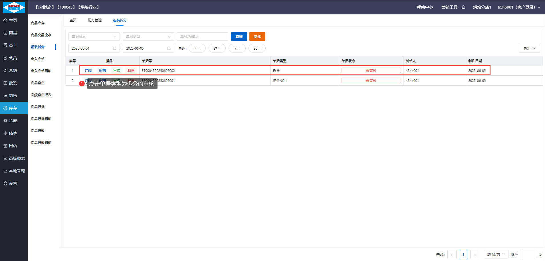 【操作步骤2】组合拆分页面,审核拆分类型的单据,即可完成商品拆分(审核后,加工商品数量减少,原料商品数量增加)。