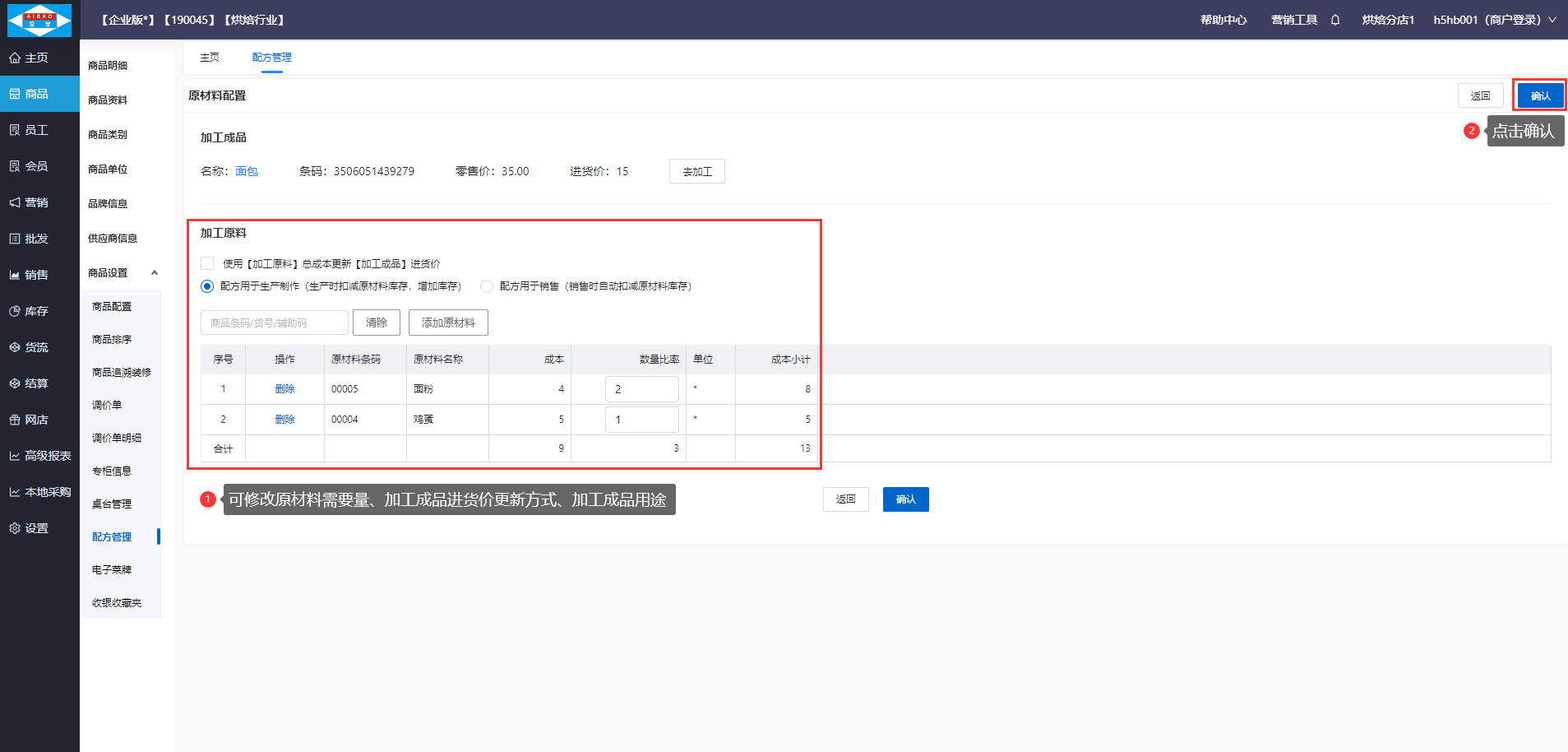 【操作步骤】点击加工成品编辑进入原材料配置页面,点击添加原材料按钮,搜索并选择所需加工原料,按照实际配方设置原料的需求量,并设置【加工成品】进货价更新方式及加工成品的用途,设置完成后点击确认即可。