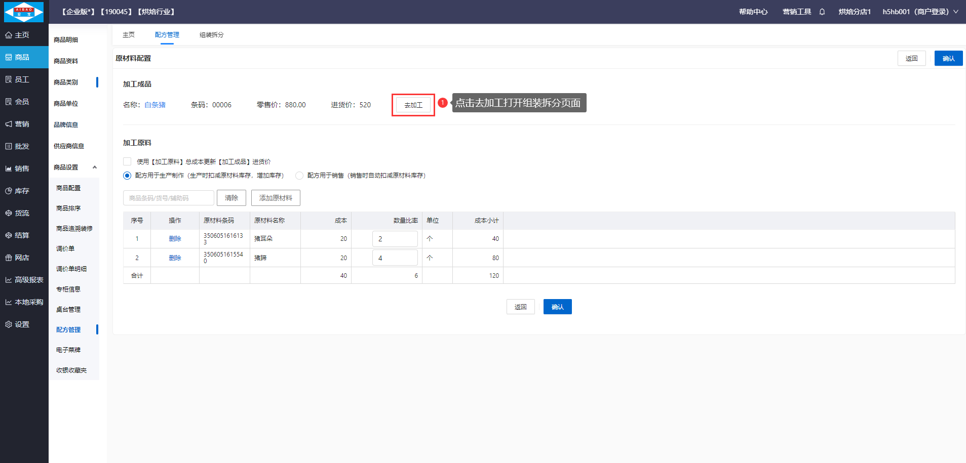【前置条件】需要在商品资料创建好加工成品:白条猪,加工原料:猪蹄、猪耳朵,并已设置加工成品:白条猪的拆分配方。