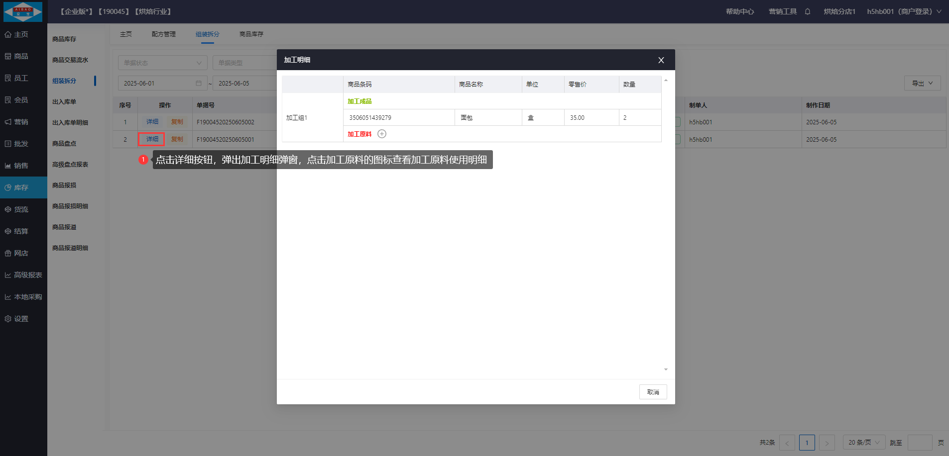 【操作步骤】点击组装拆分单据的详细按钮,弹出加工明细弹窗,点击加工原料图标查看加工原料使用明细。