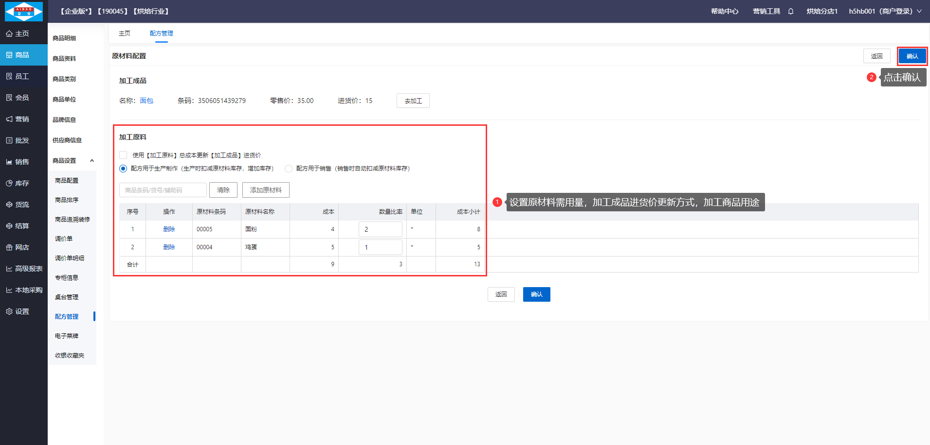 【操作步骤】新建加工成品,设置加工成品的单位、进货价、零售价后,点击确认即可(同样的步骤创建配方原料)。