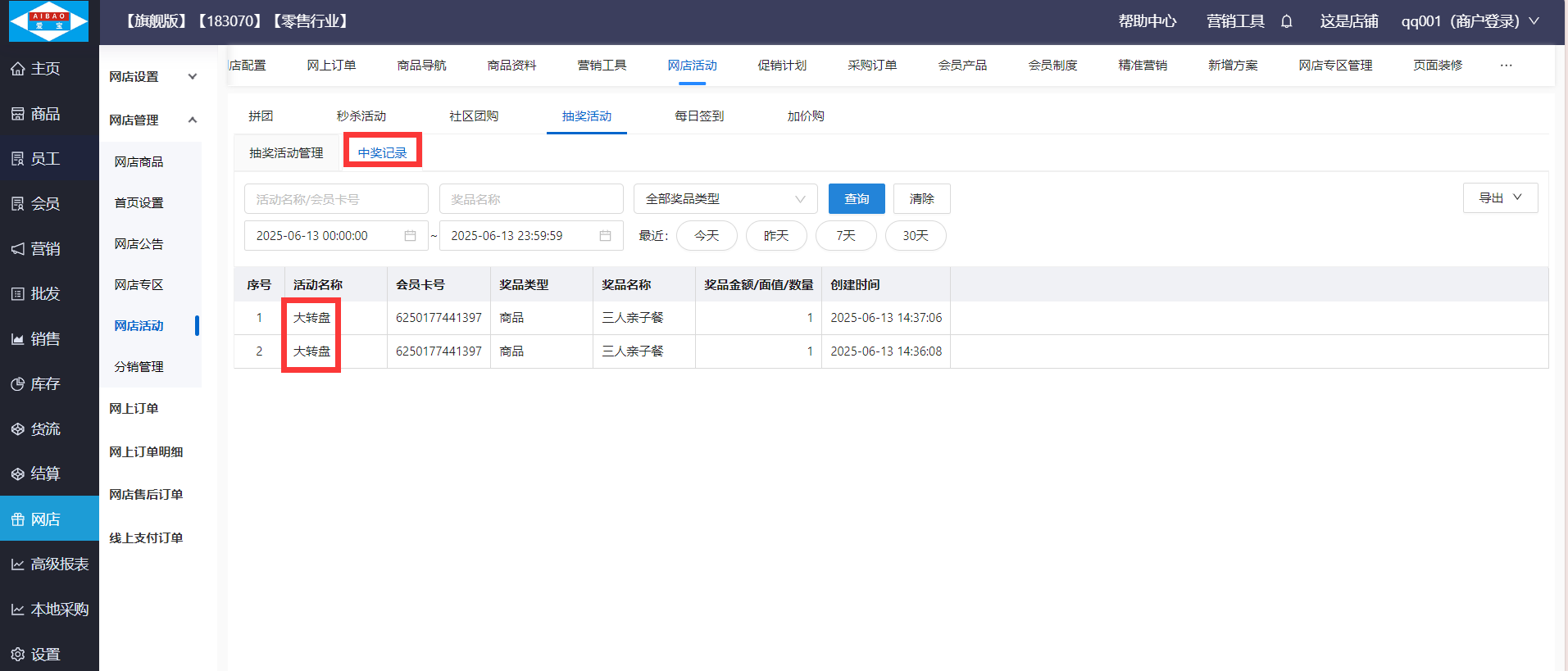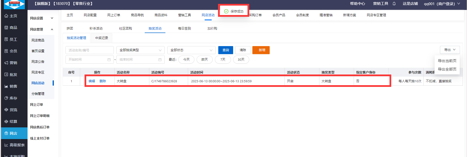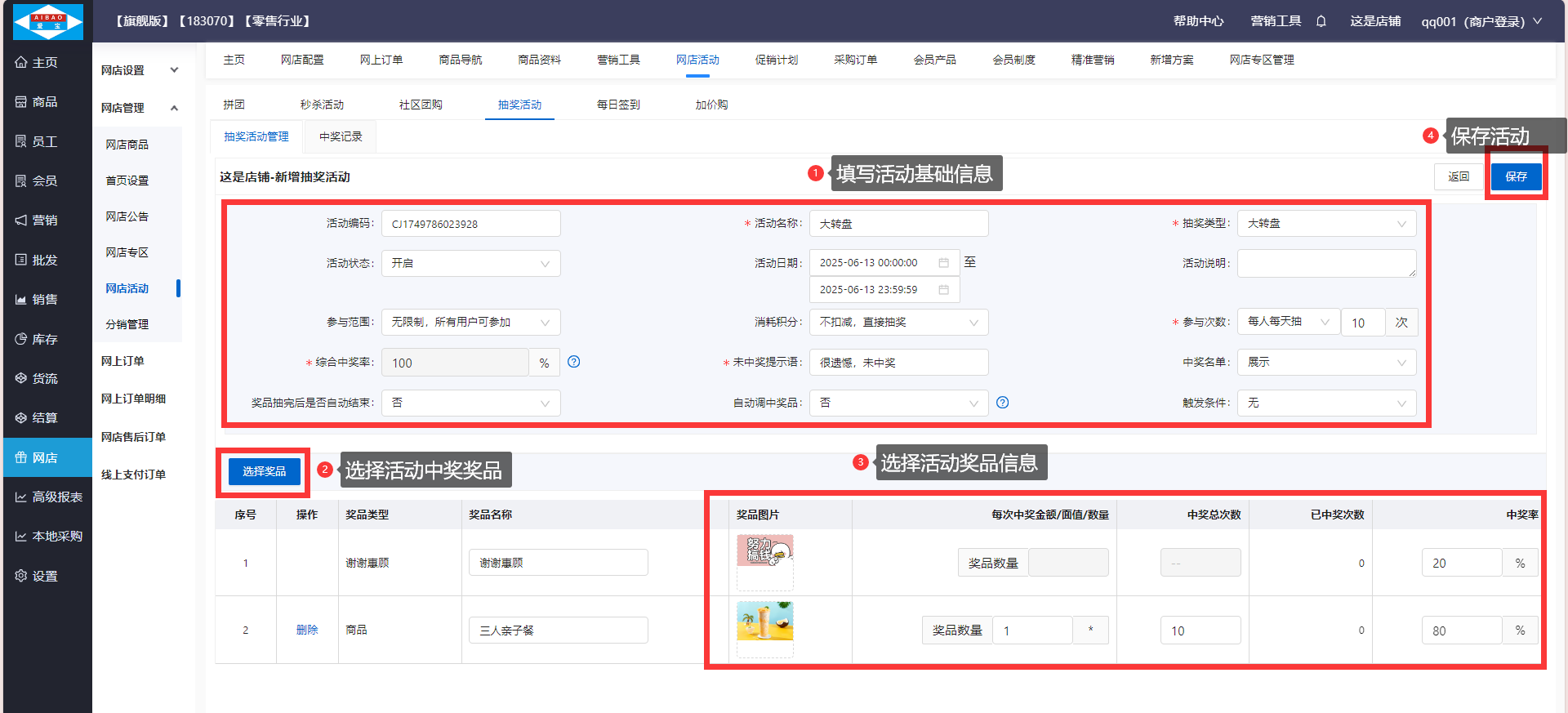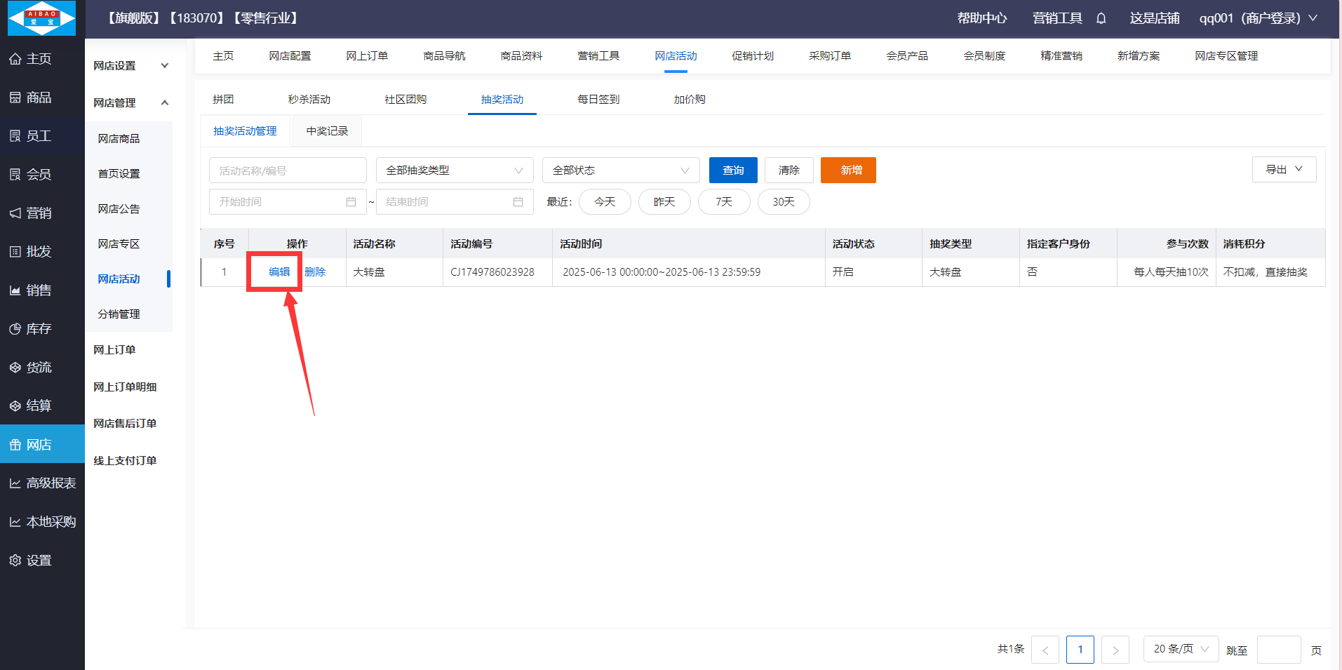 路径:【网店】-【网店管理】-【网店活动】-【抽奖活动】