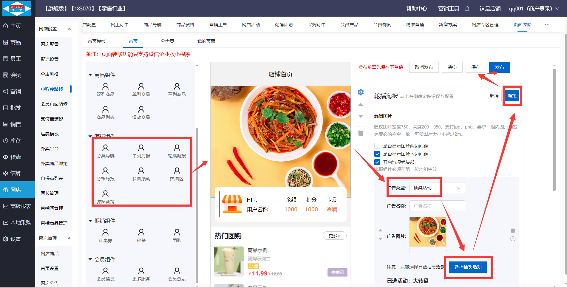 方式2:将海报组件拉至装修区,广告类型选择抽奖活动,并选择大转盘抽奖,确认组件后,保存装修模板并发布小程序