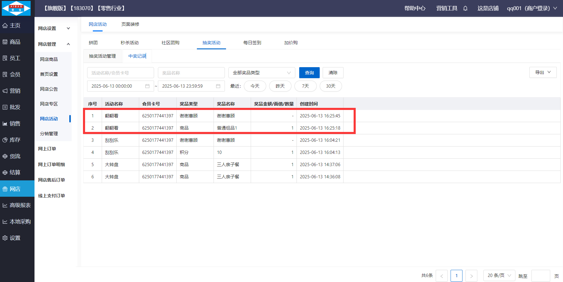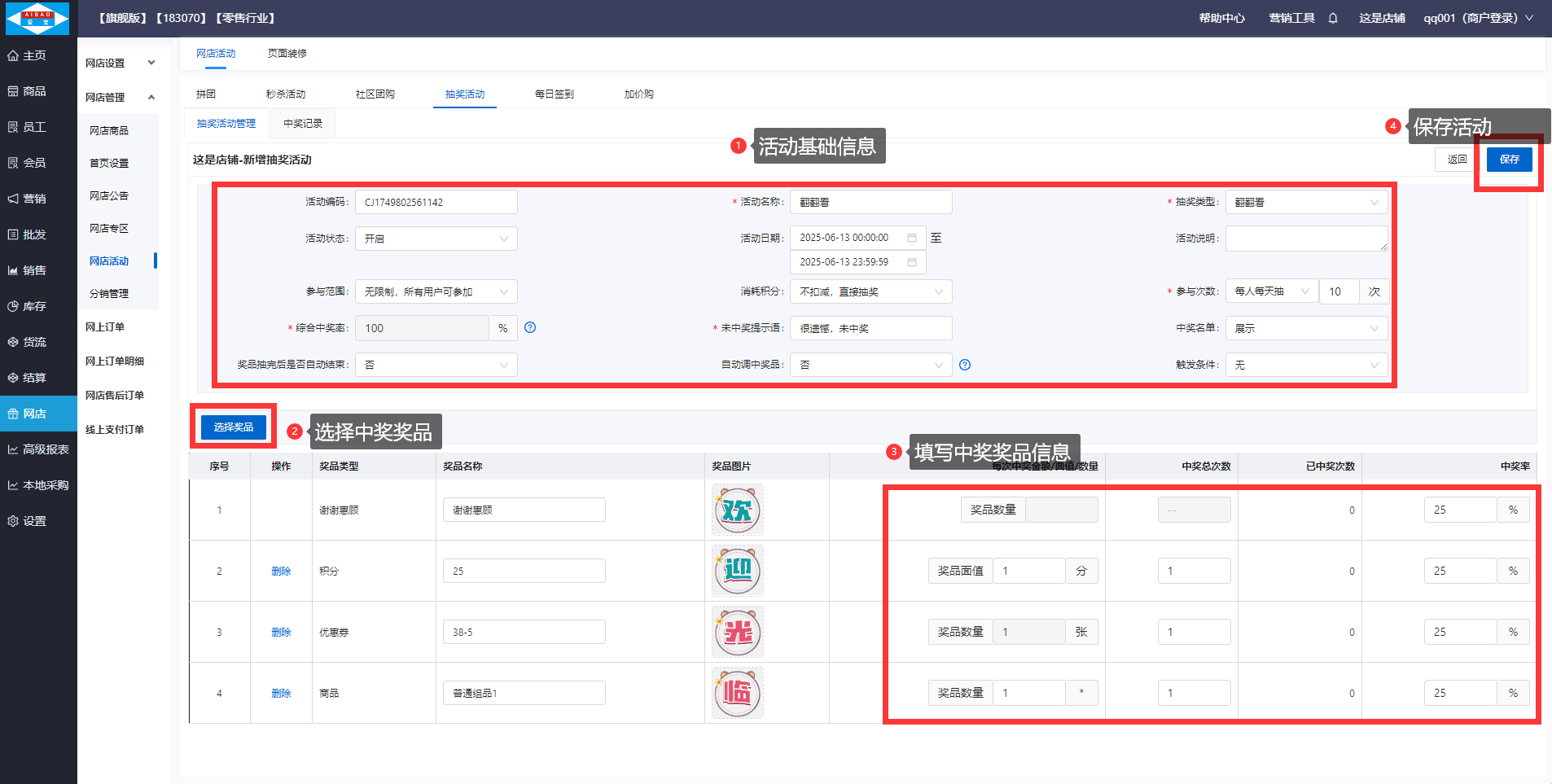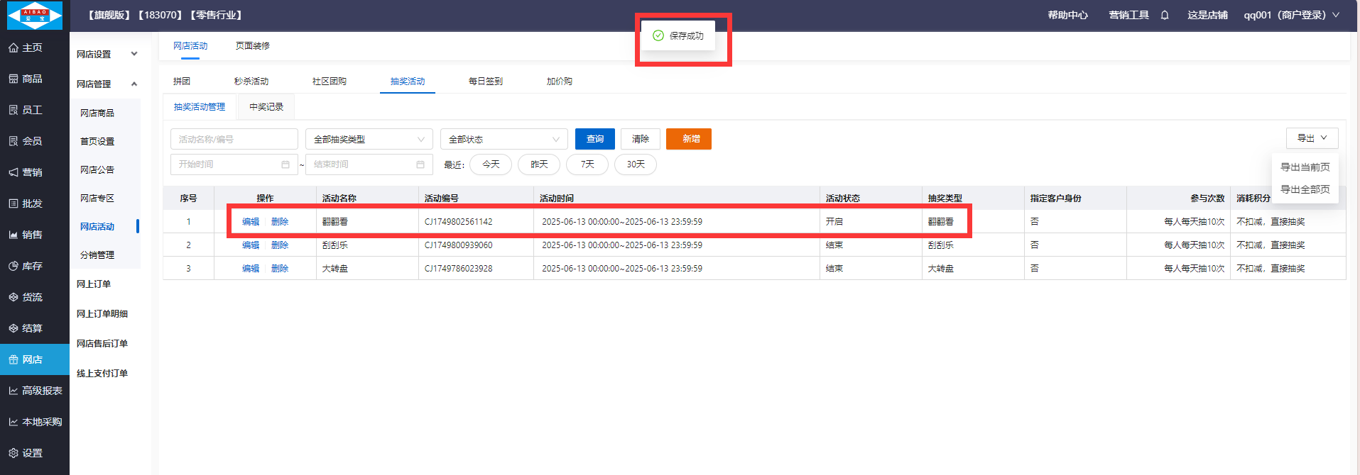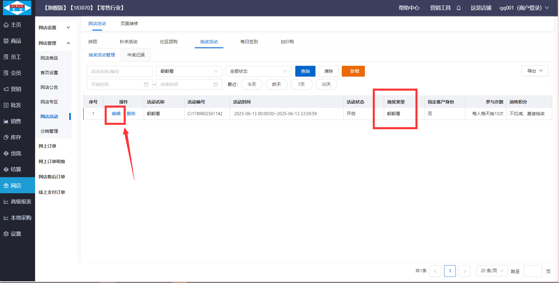 路径:【网店】-【网店管理】-【网店活动】-【抽奖活动】