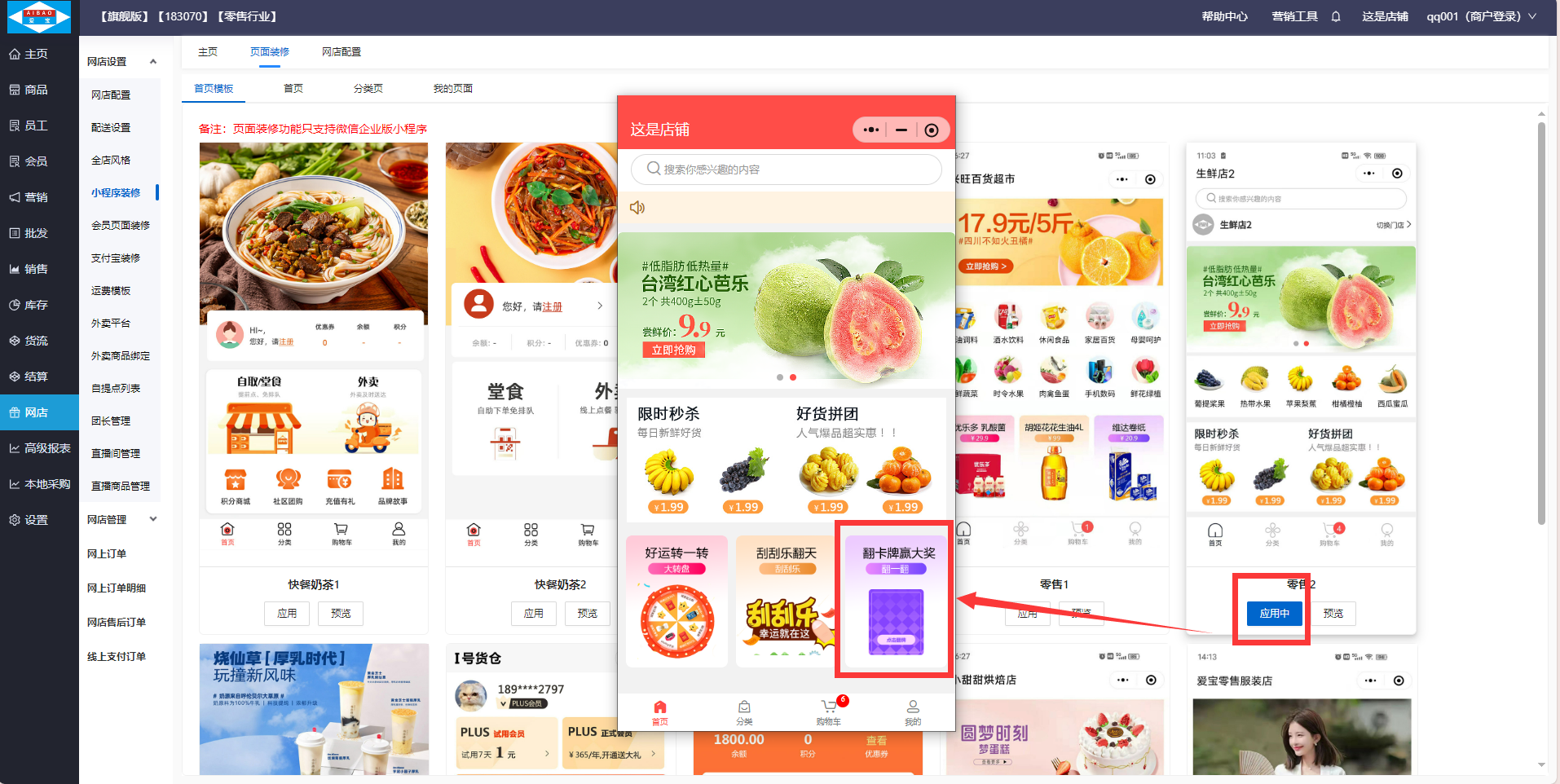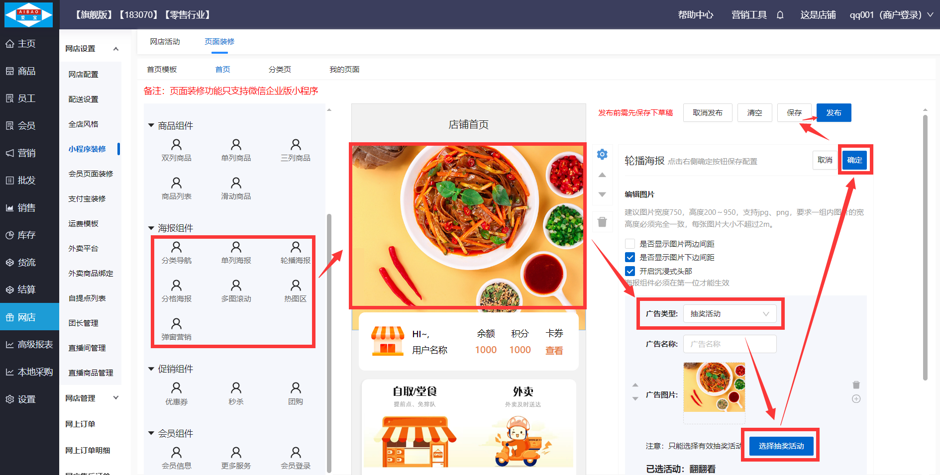 方式2:将海报组件拉至装修区,广告类型选择抽奖活动,并选择翻翻看抽奖,确认组件后,保存装修模板并发布小程序