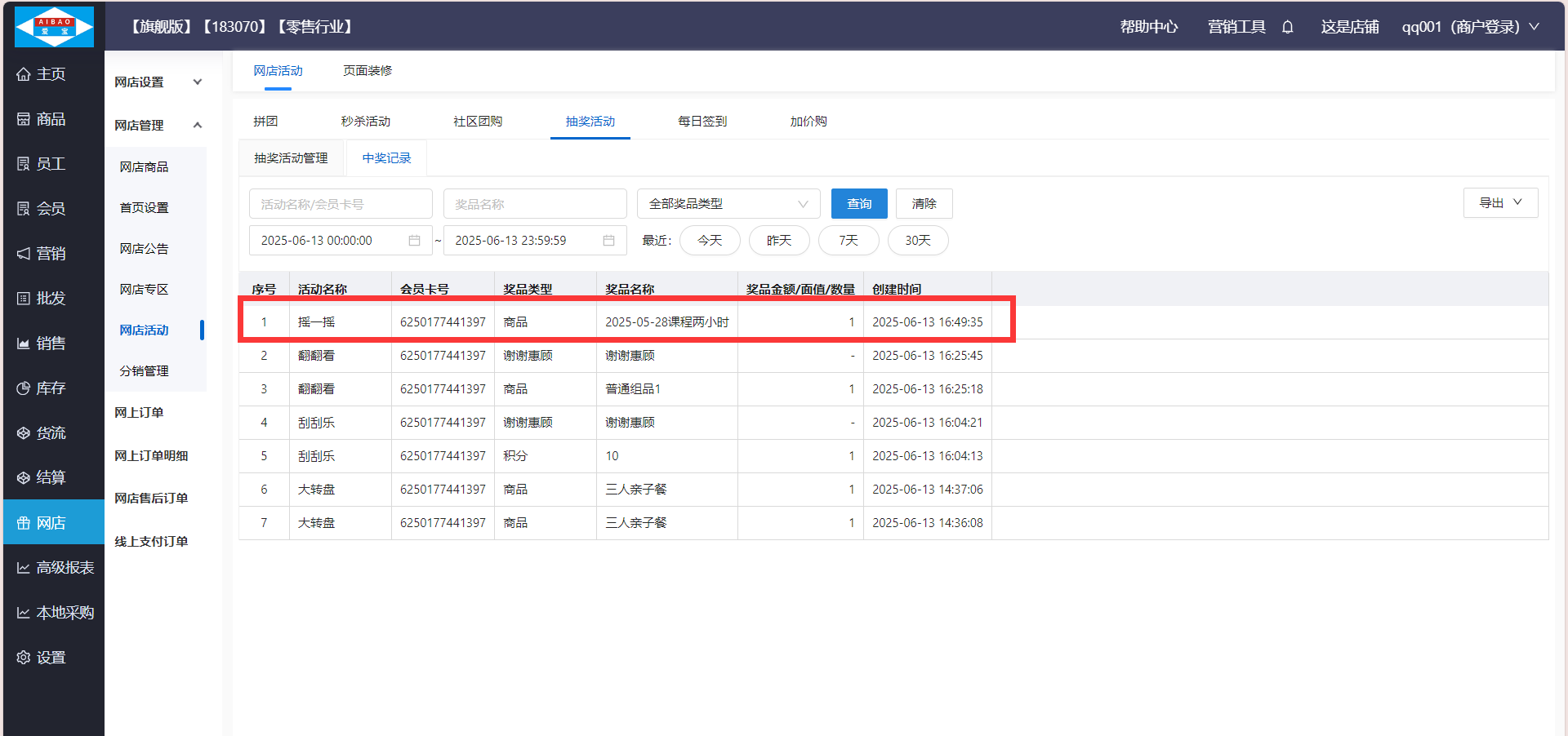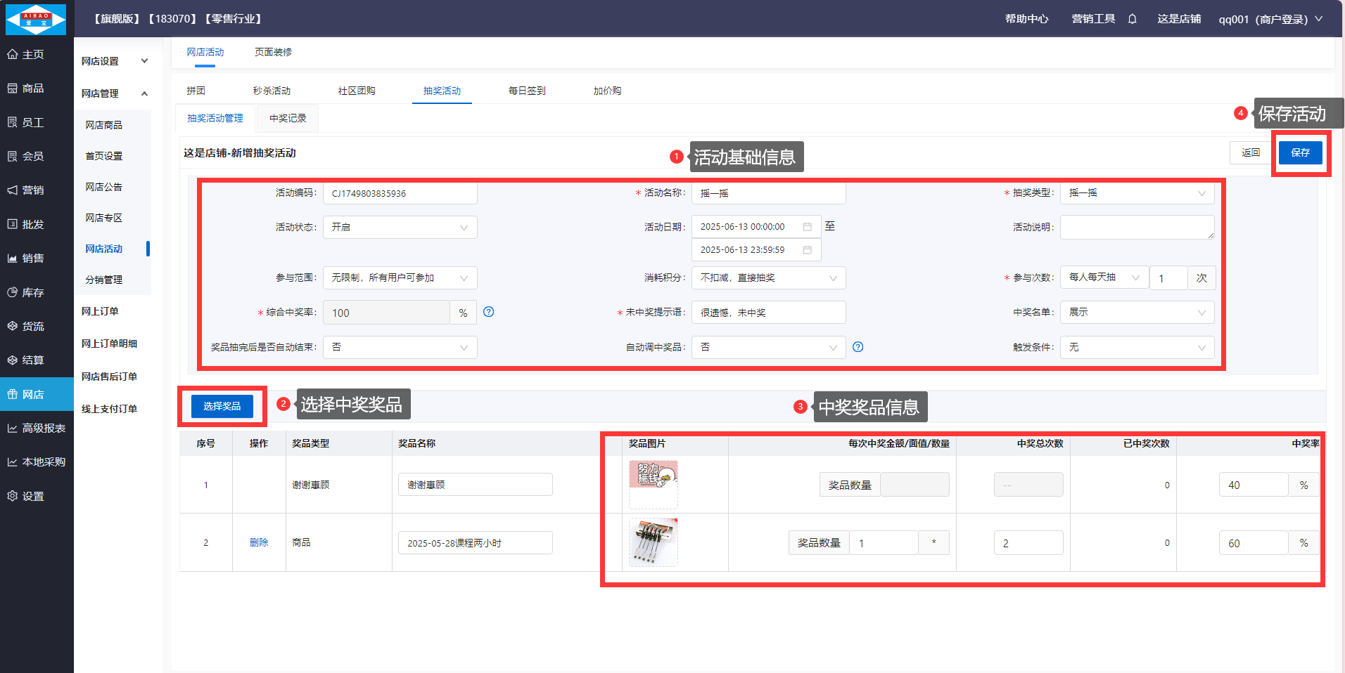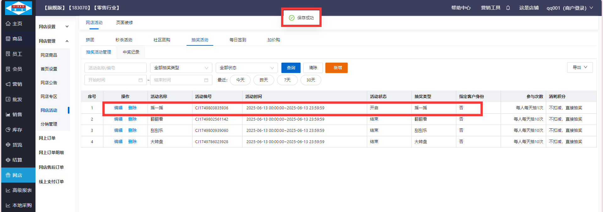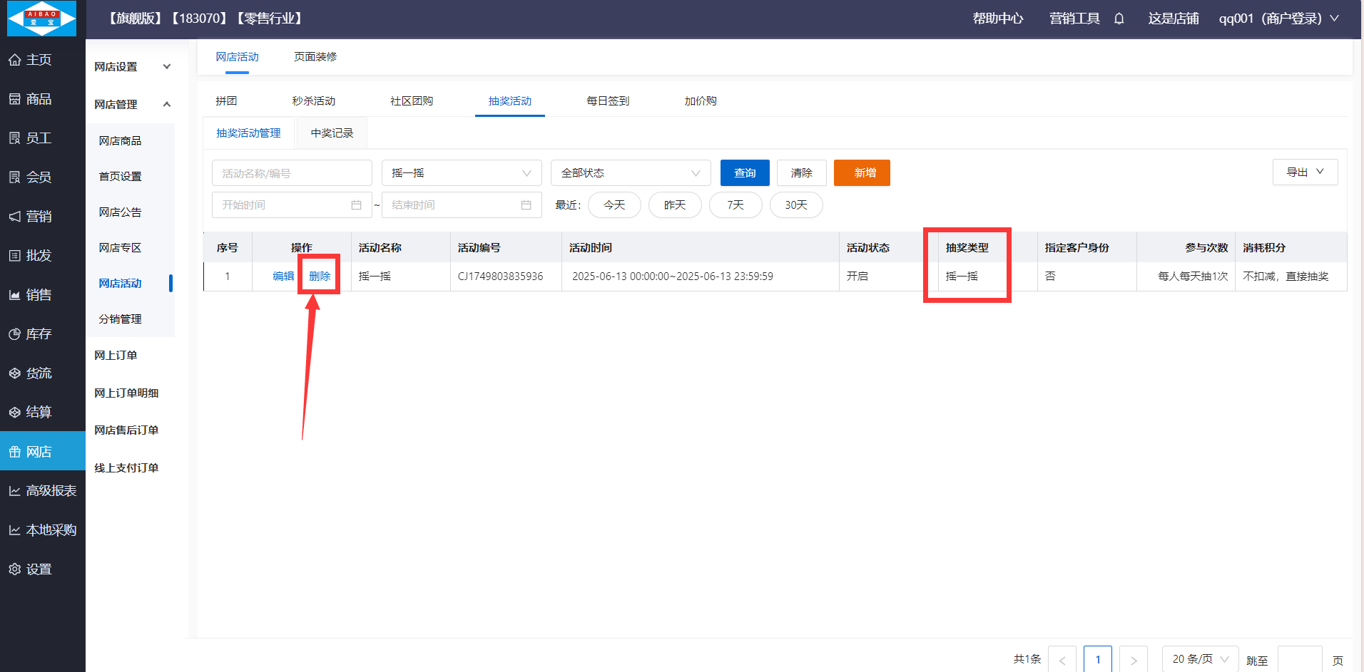 路径:【网店】-【网店管理】-【网店活动】-【抽奖活动】