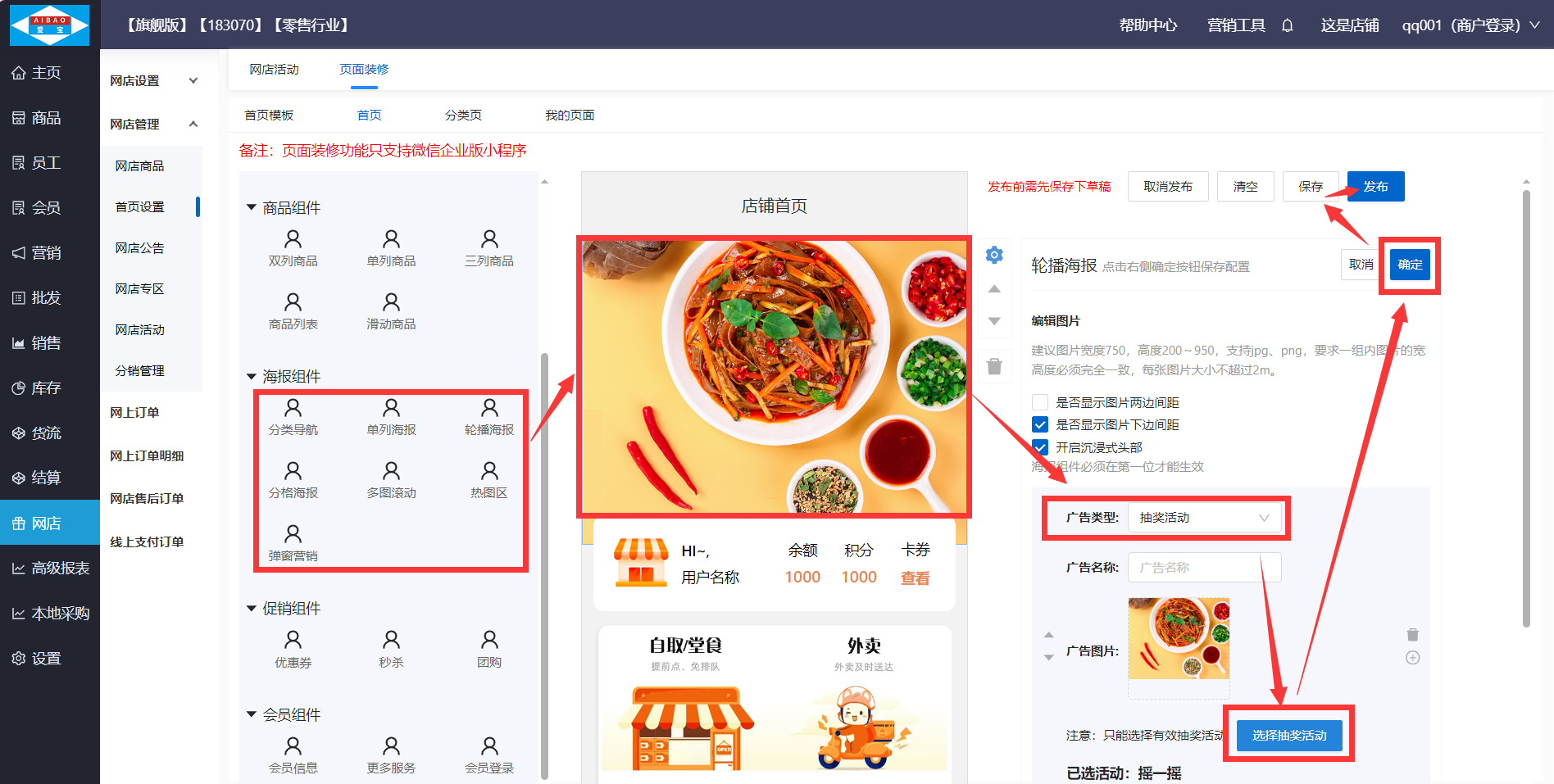 将海报组件拉至装修区,广告类型选择抽奖活动,并选择摇一摇抽奖,确认组件后,保存装修模板并发布小程序