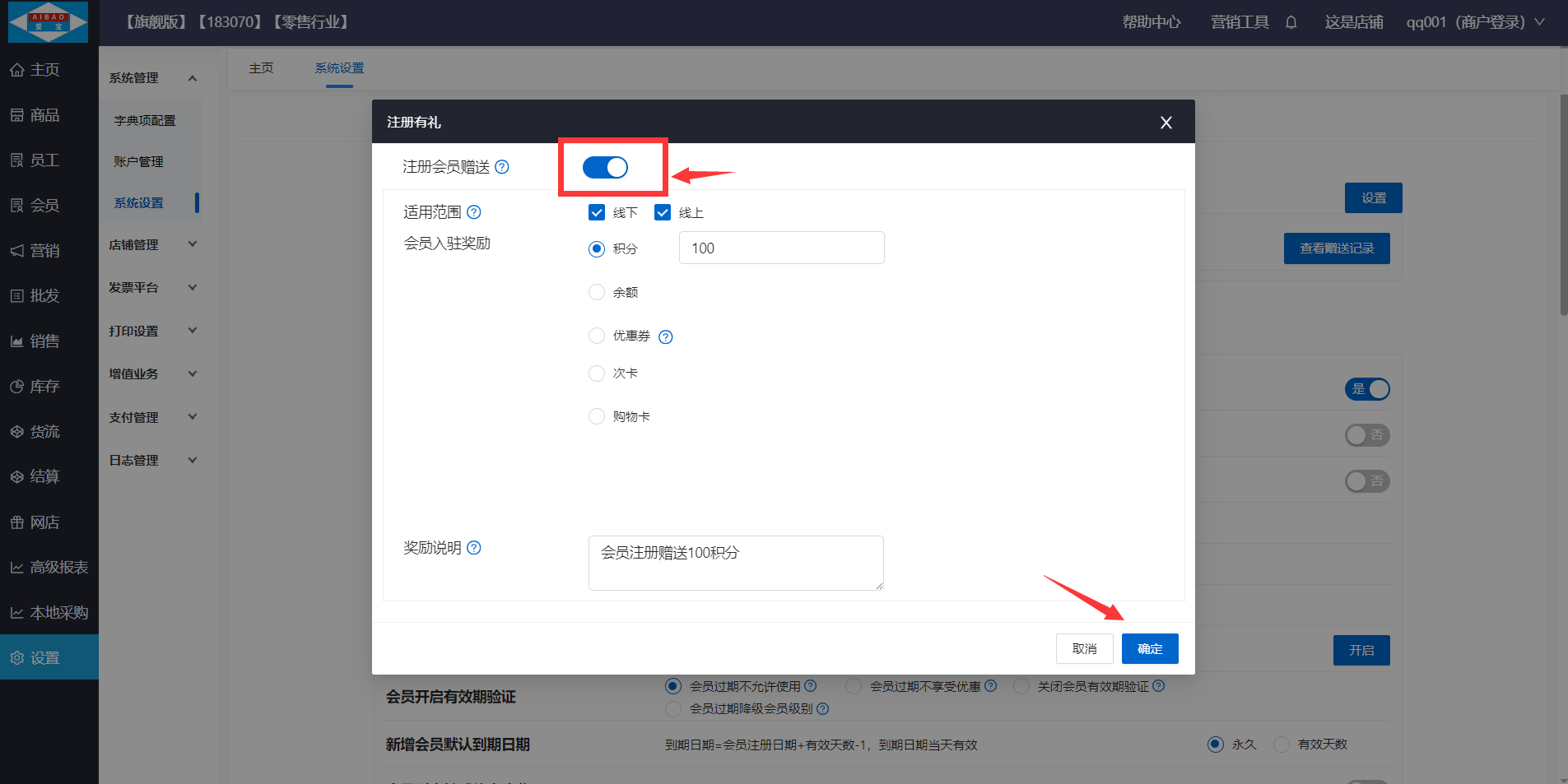 开启注册会员赠送,勾选适用范围,填写会员入驻奖励以及奖励说明,确认即可。