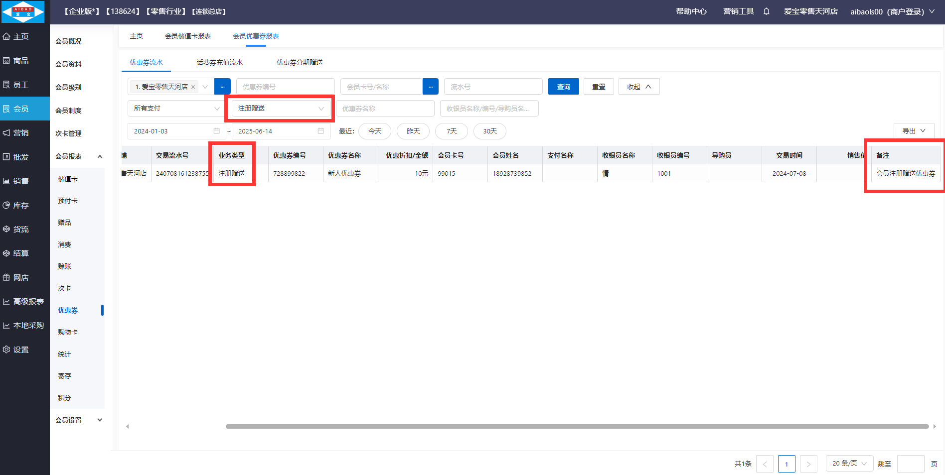 赠送优惠券查看路径:【会员】-【会员报表】-【优惠券】,业务类型选择注册赠送,记录备注显示:会员注册赠送优惠券