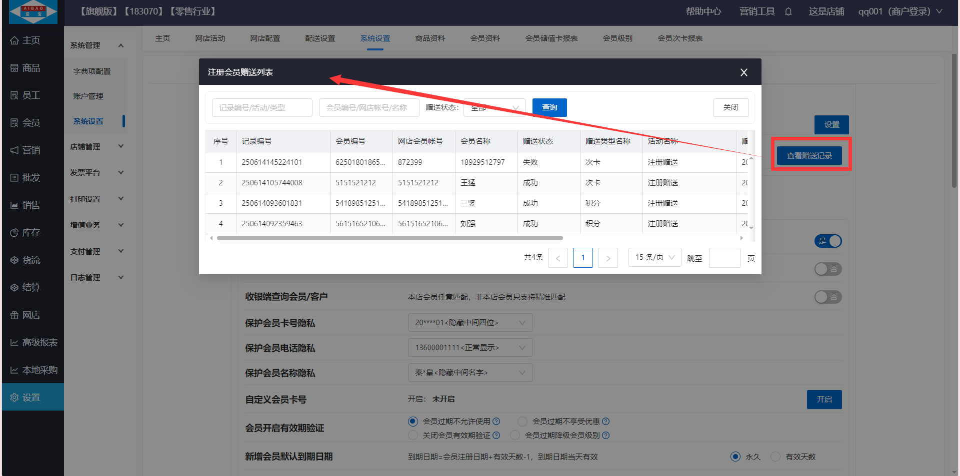 方式1:在注册有礼设置页面直接点击查看赠送记录