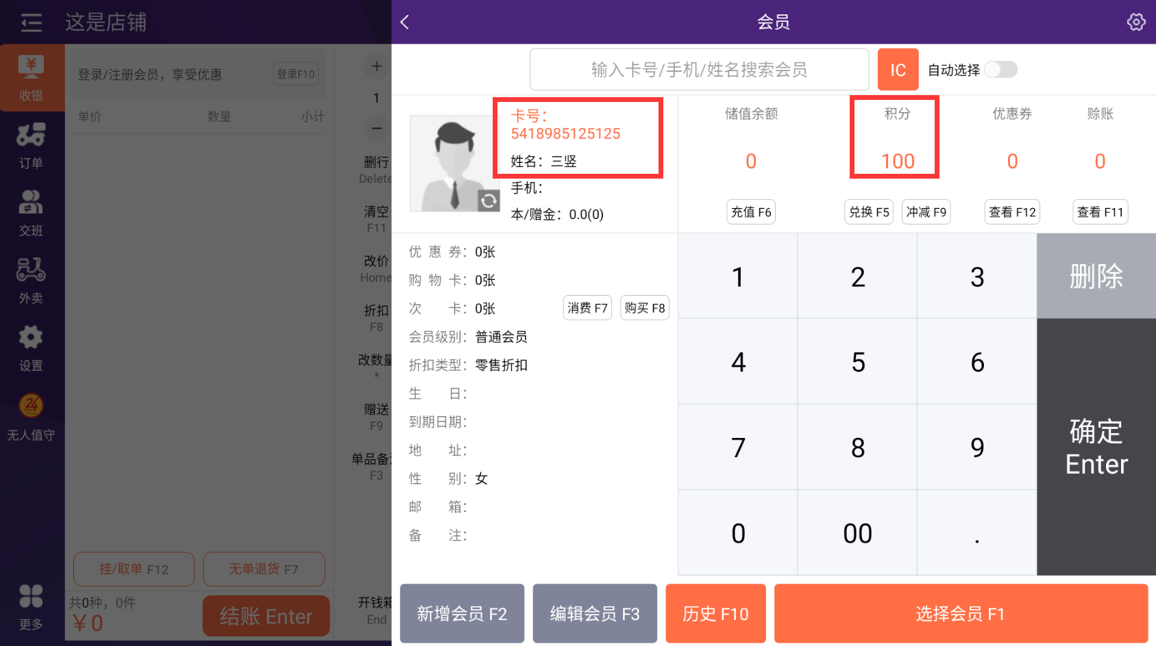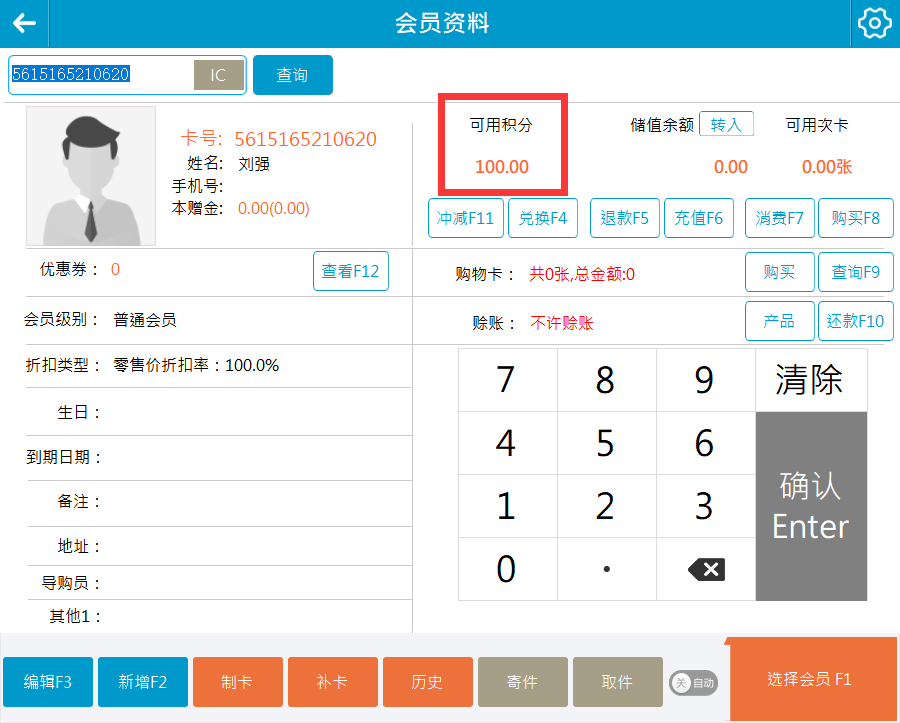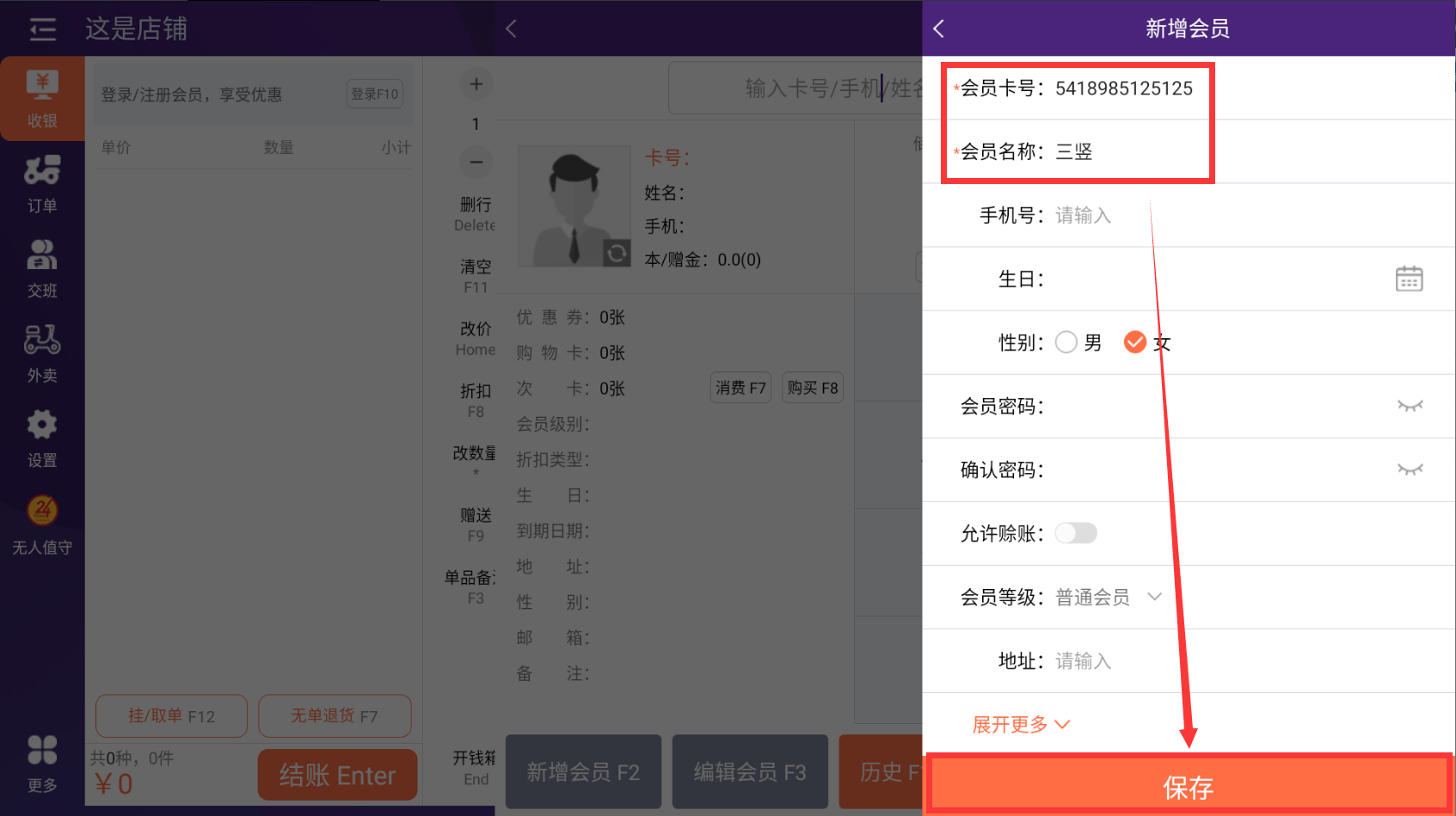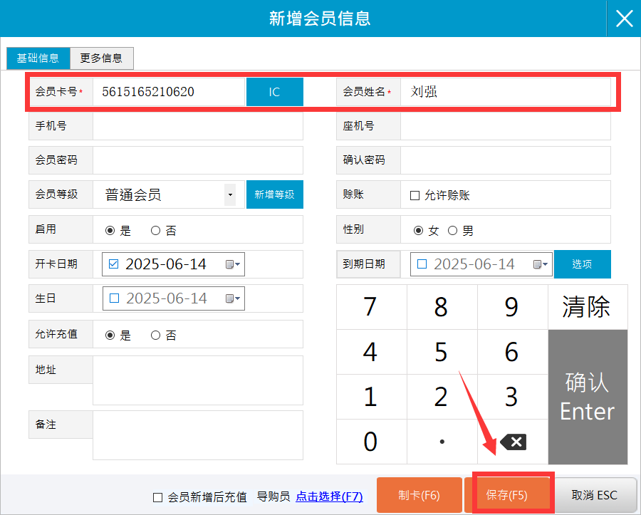 输入会员卡号和姓名后,保存(快捷键F5)即可