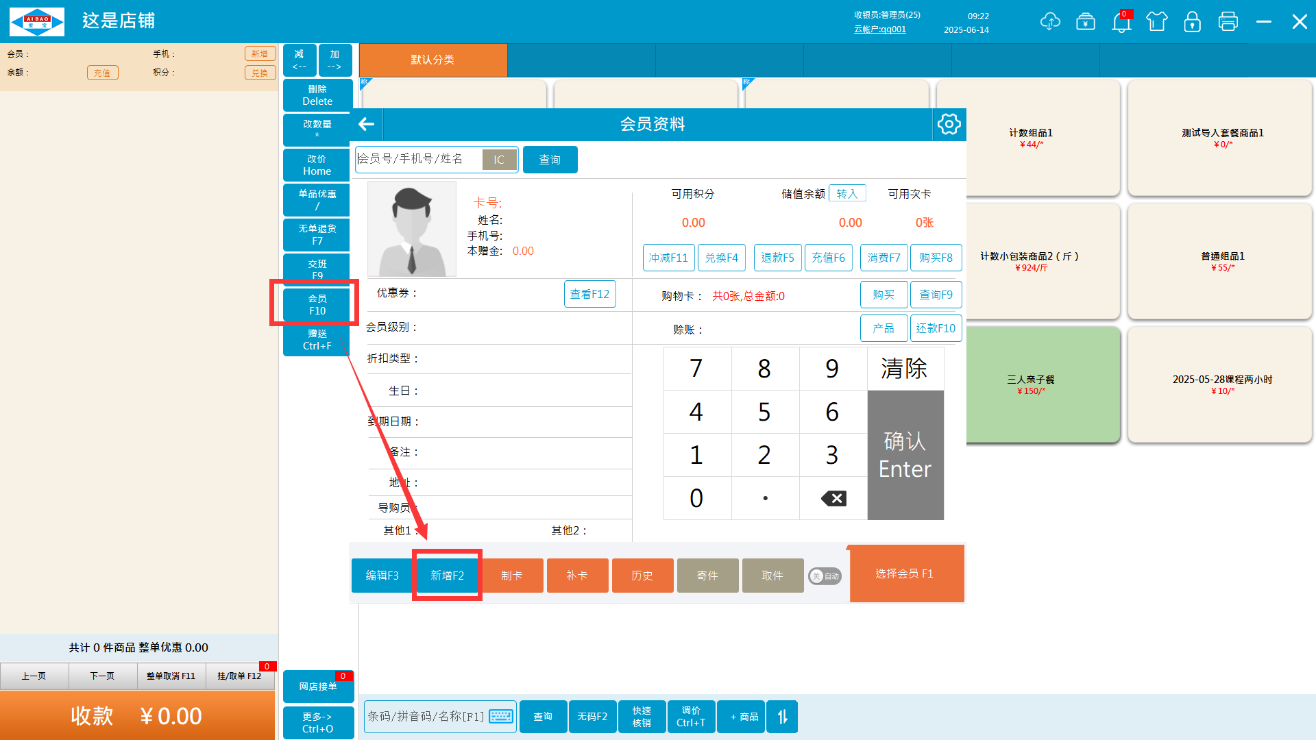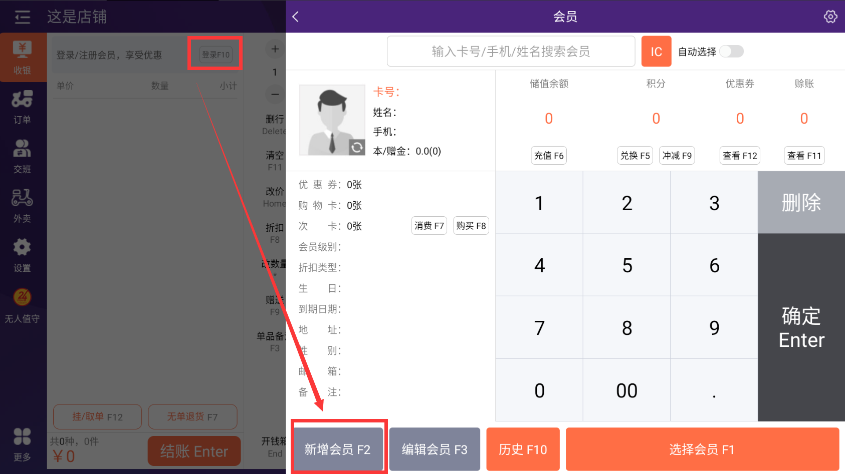 在收银端点击会员(快捷键F10),点击新增(快捷键F2)