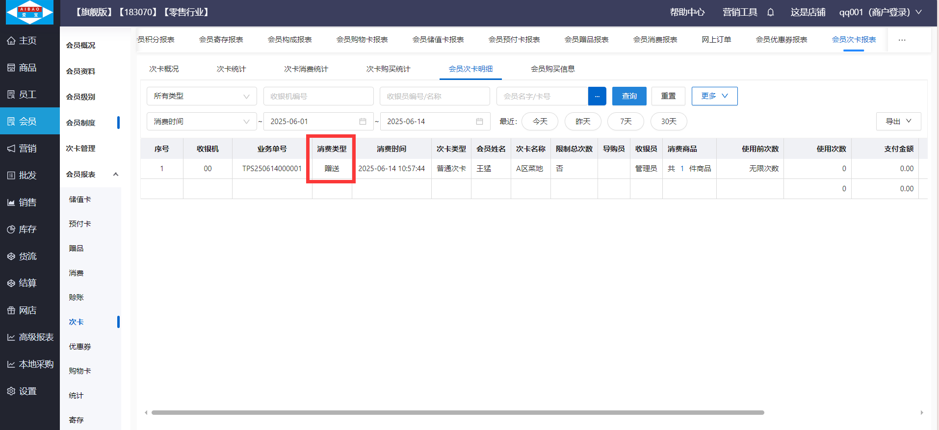 赠送次卡查看路径:【会员】-【会员报表】-【次卡】,在会员次卡明细查看消费类型为赠送的记录,备注为:会员注册赠送次卡:次卡名称【1】张;