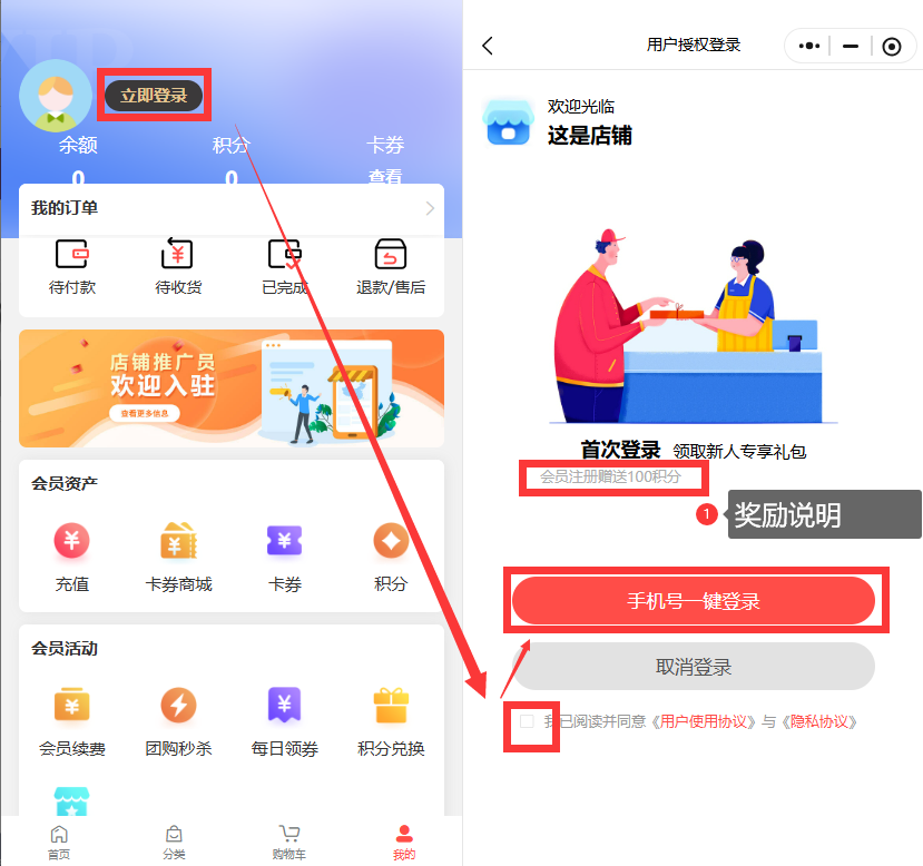 2、会员入驻奖励:支持赠送积分、余额、优惠券、次卡、购物卡(注:优惠券必须是适用范围包含线上的并且开启会员领取的(注:如果”限制用户线上领取“按钮不开启,需要包含网店默认会员级别))