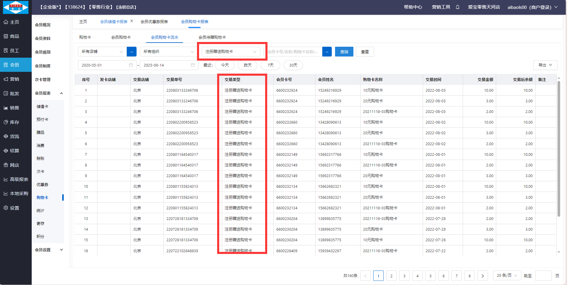 赠送购物卡查看路径:【会员】-【会员报表】-【购物卡】,在会员购物卡流水查看业务类型:注册赠送购物卡