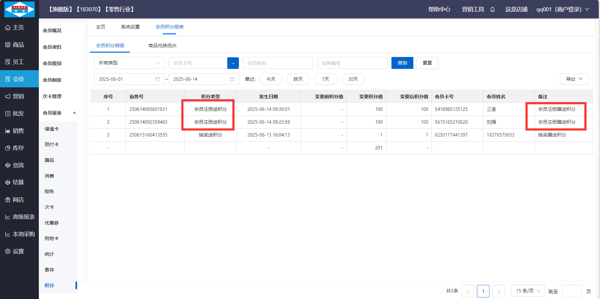 方式2:注册赠送积分,在【会员】-【会员报表】-【积分】查看赠送记录,记录备注显示:会员注册赠送积分