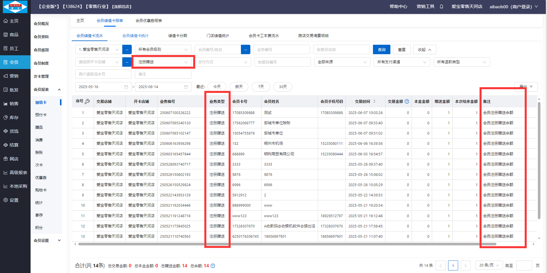 赠送余额查看路径:【会员】-【会员报表】-【储值卡】,业务类型选择注册赠送,记录备注显示:会员注册赠送余额
