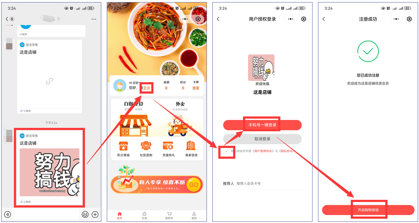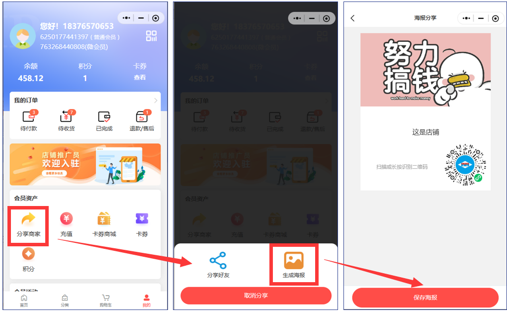 会员在小程序点击分享商家,选择分享好友或生成海报,好友点击后注册,自动成为分享会员的下级