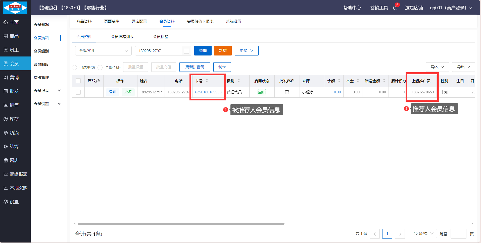 在【会员】-【会员资料】查看被推荐人的会员资料,对应的上级推广员即是推荐人信息