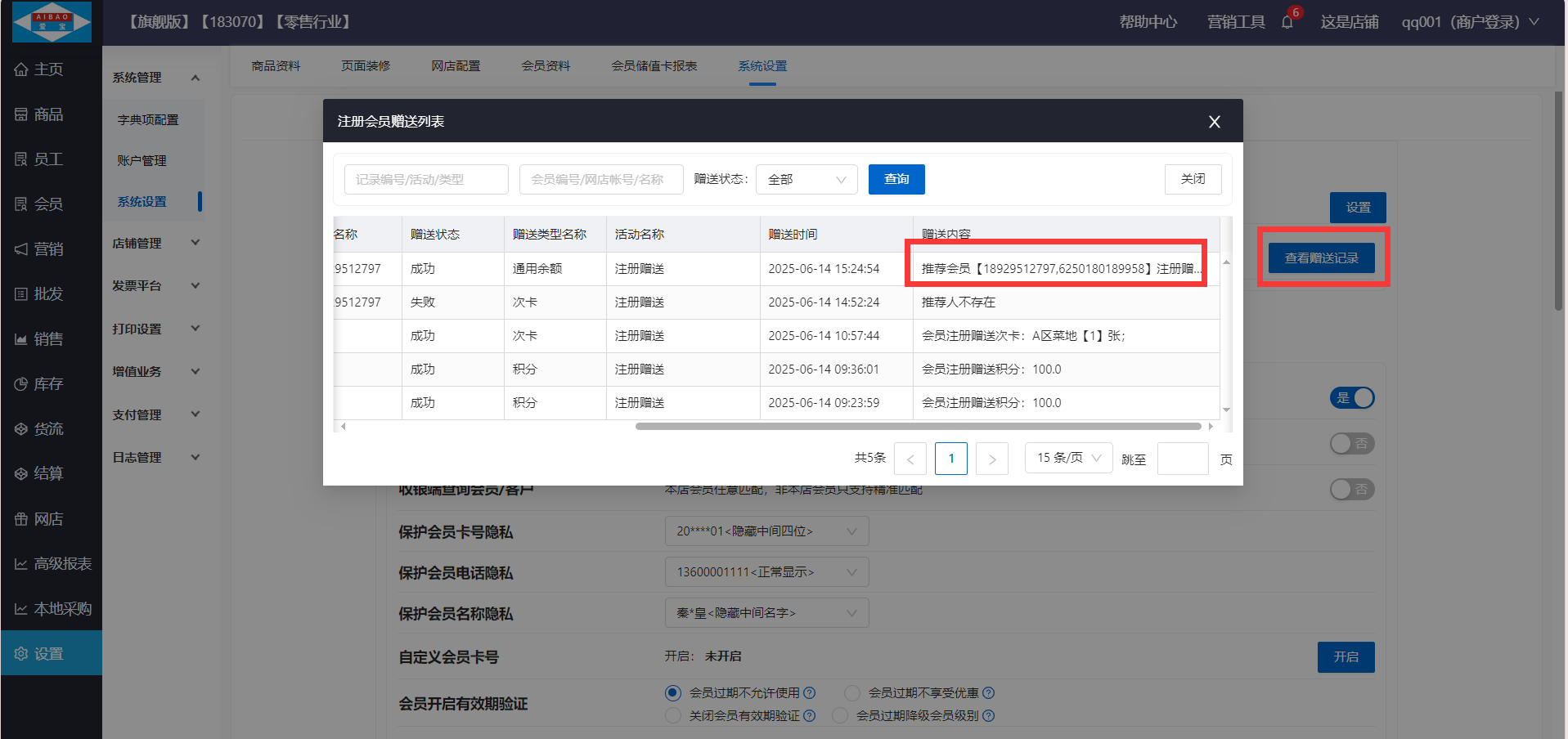 方式1:推荐人在【设置】-【系统管理】-【系统设置】-【会员参数设置】-【注册有礼】查看注册会员赠送列表