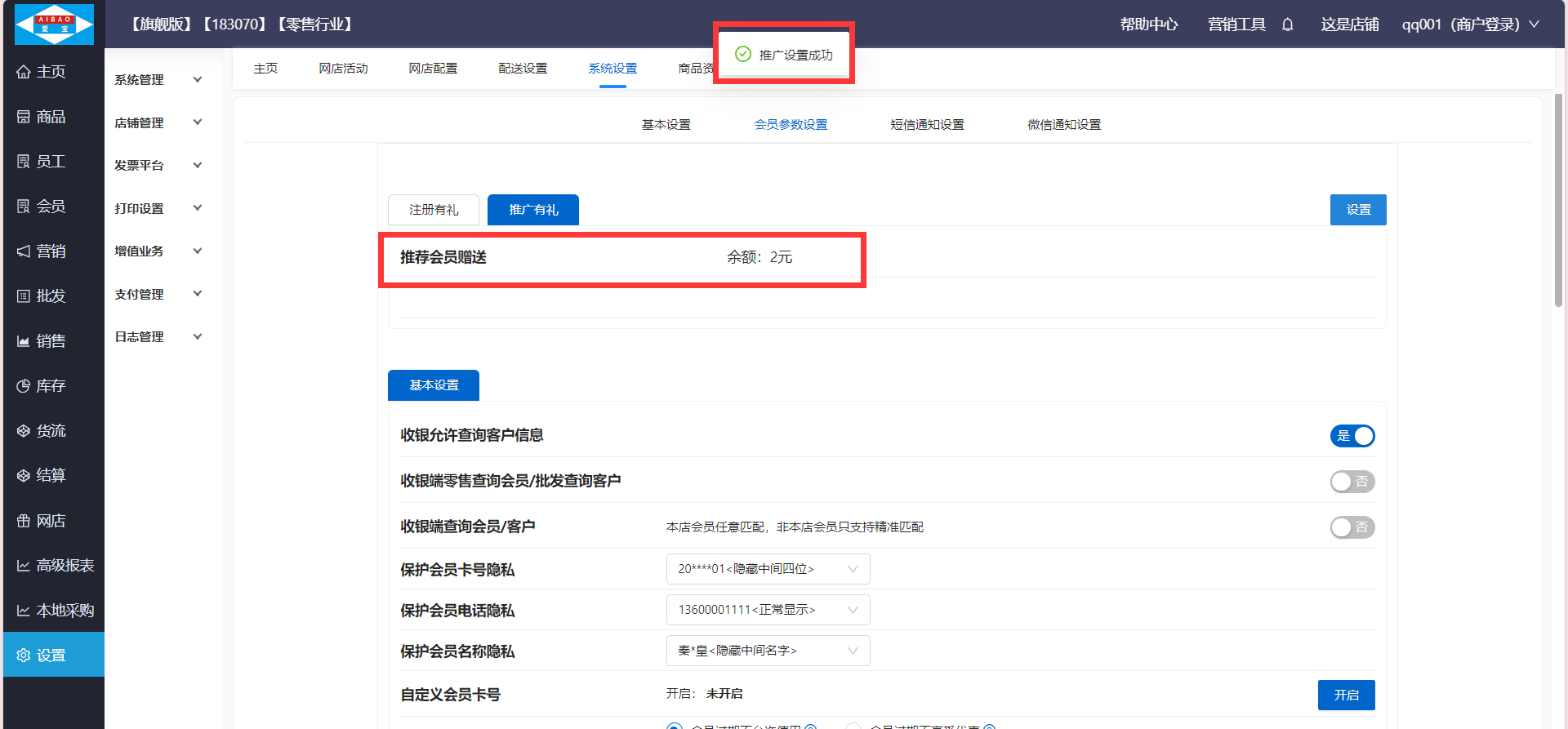 路径:【设置】-【系统管理】-【系统设置】-【会员参数设置】-【推广有礼】