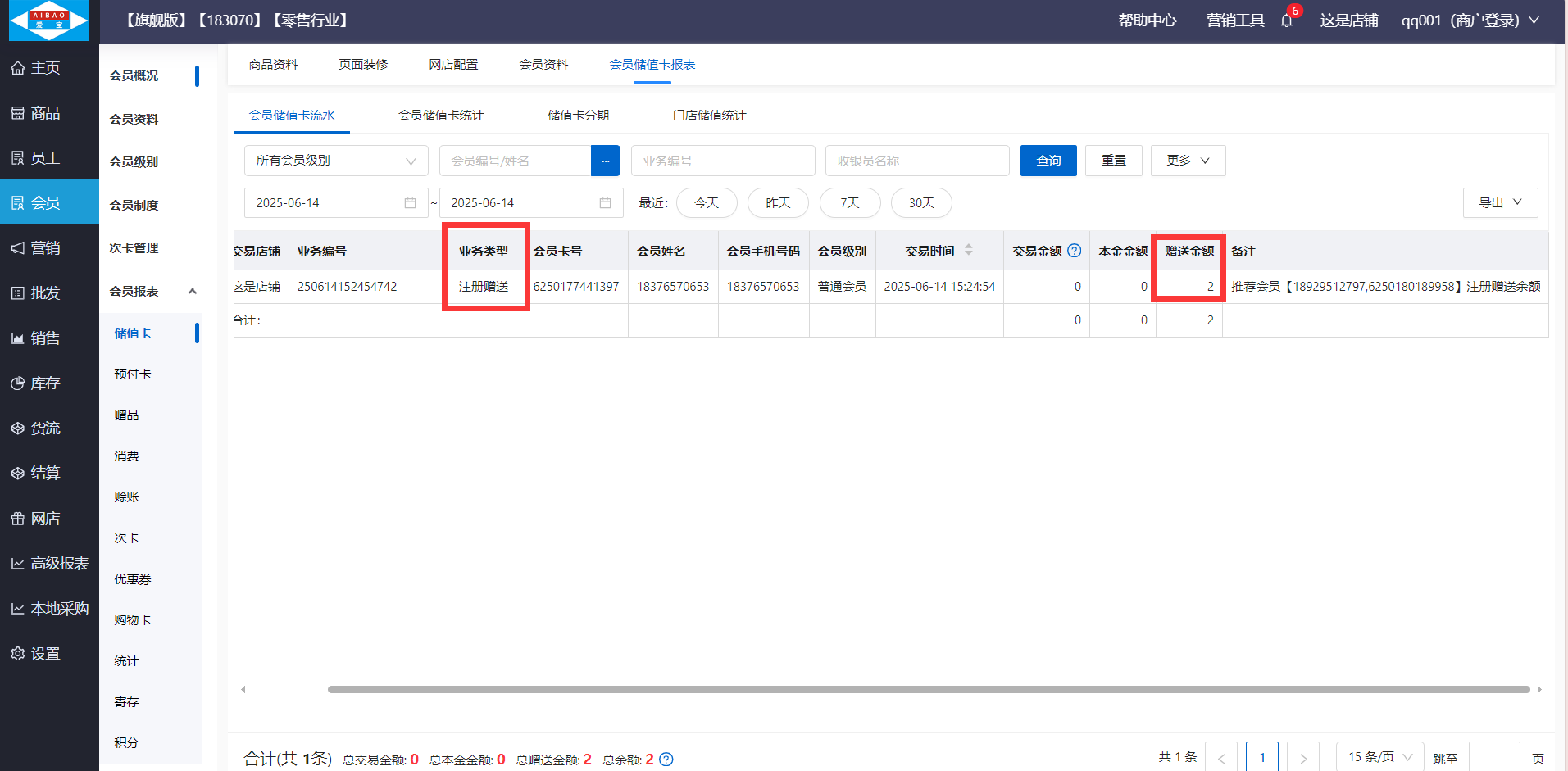 方式2:推荐人在【会员】-【会员报表】-【储值卡】-【会员储值卡流水】查看注册赠送的金额,备注会提示:推荐会员【手机号,会员卡号】注册赠送余额