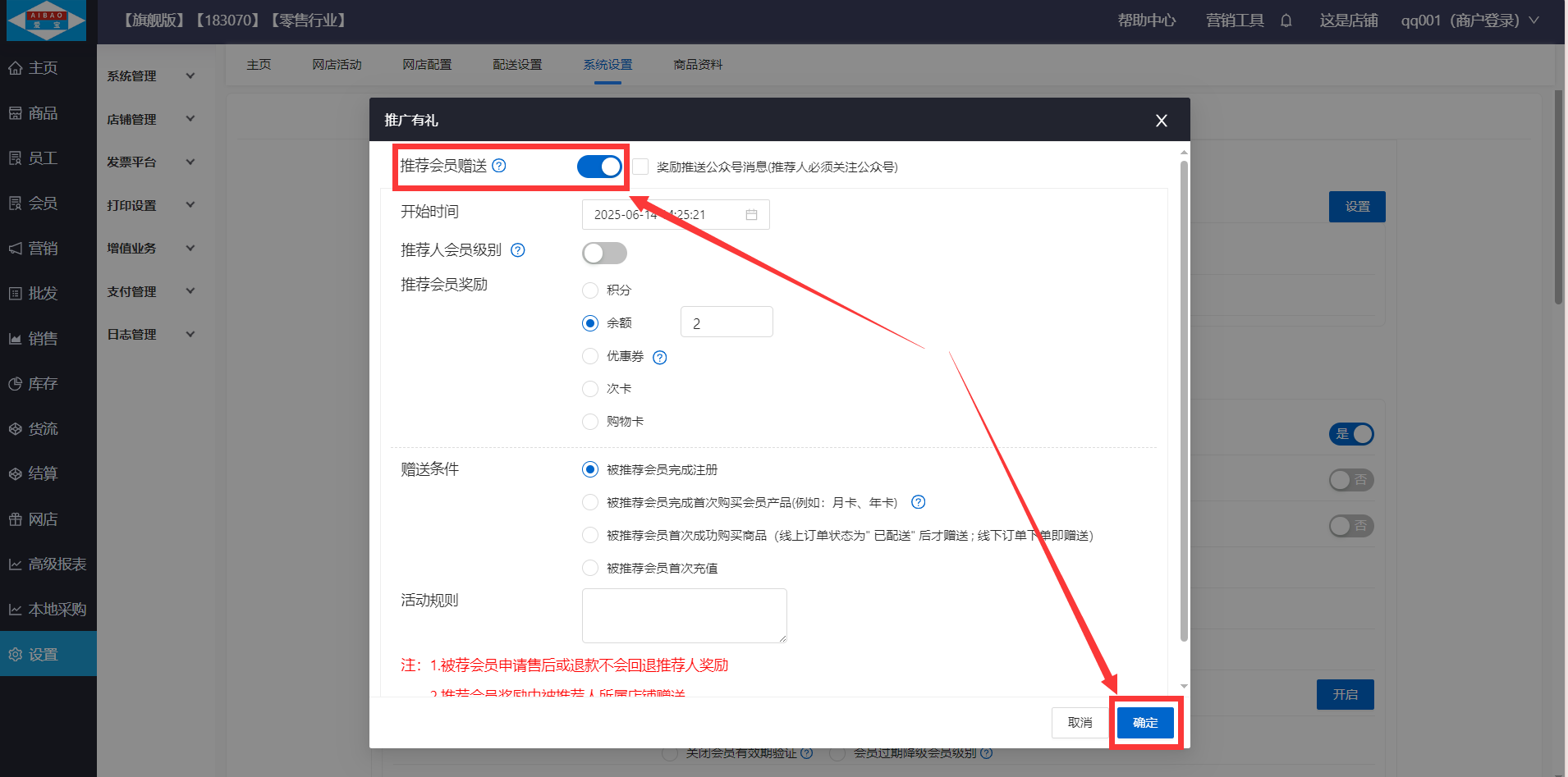 填写开启时间,推荐人会员级别(选填),推荐会员奖励,赠送条件,以及活动规则,确认即可。