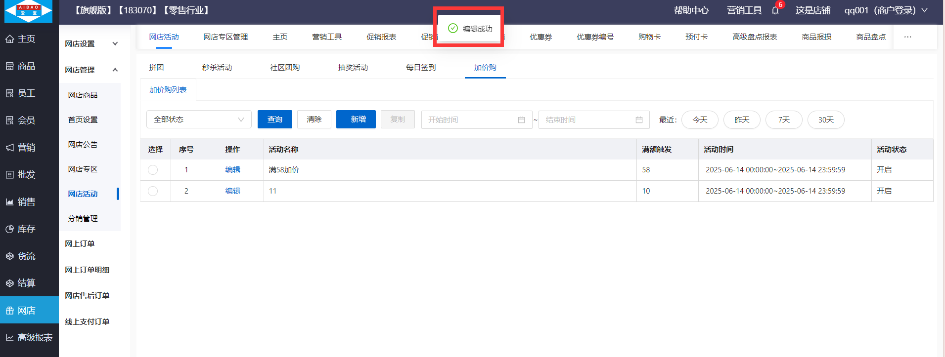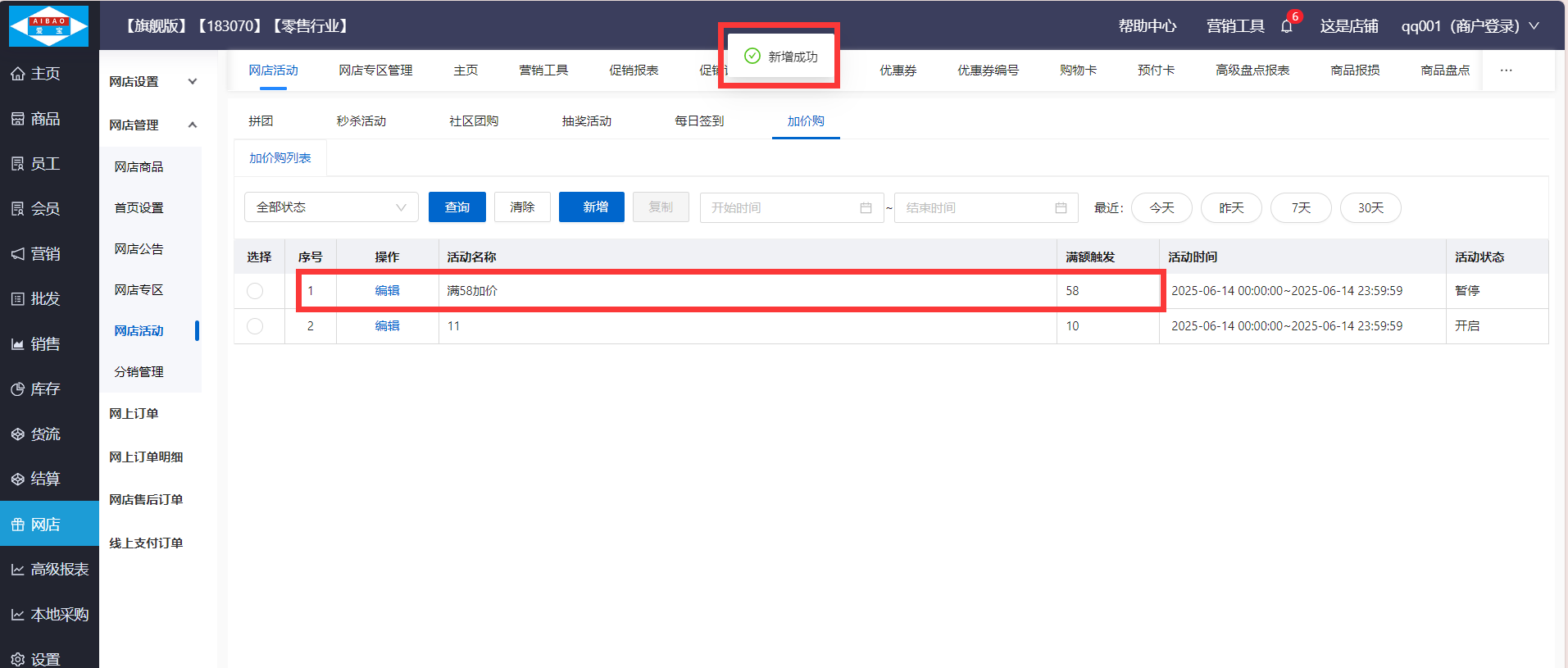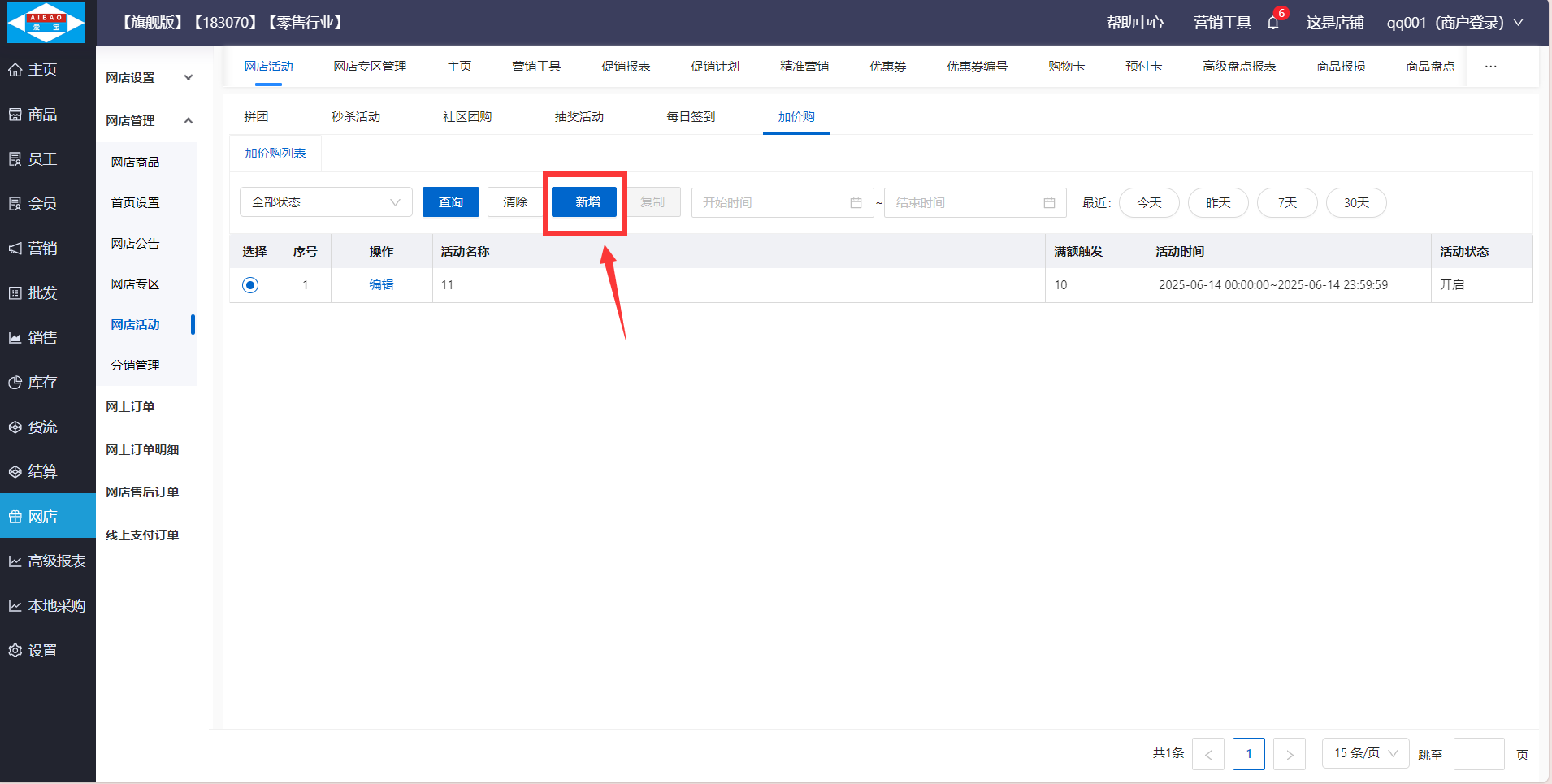 路径:【网店】-【网店管理】-【网店活动】-【加价购】