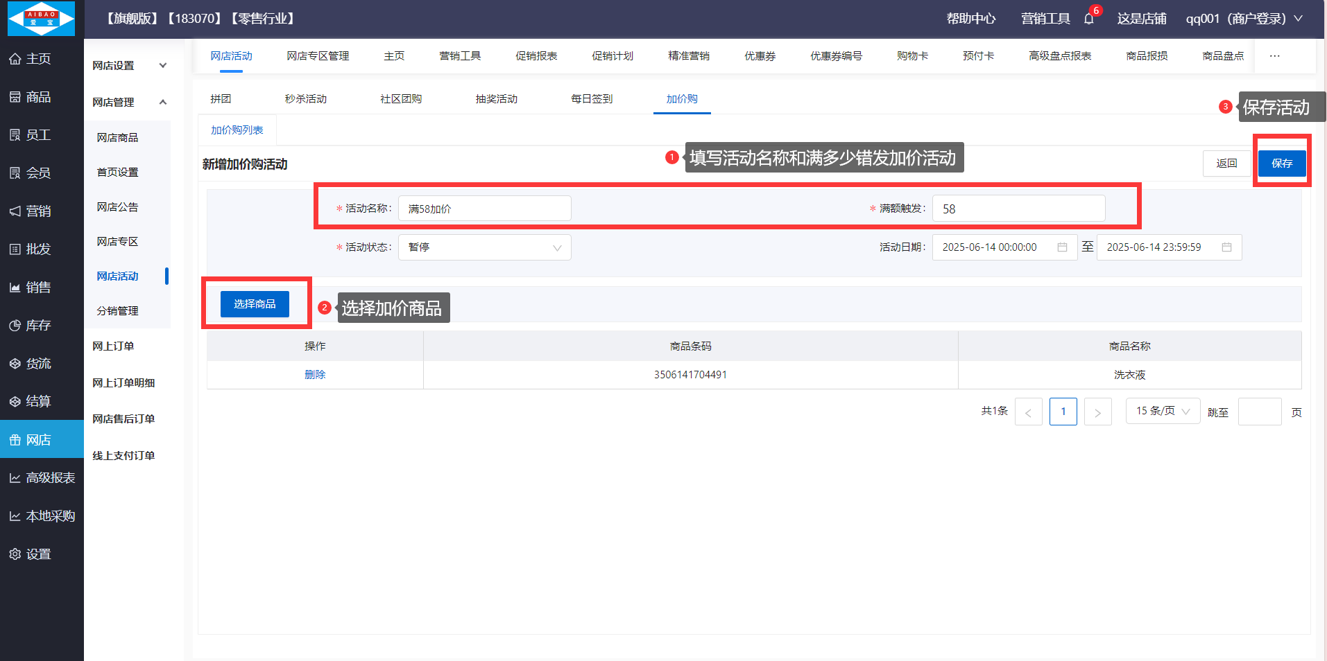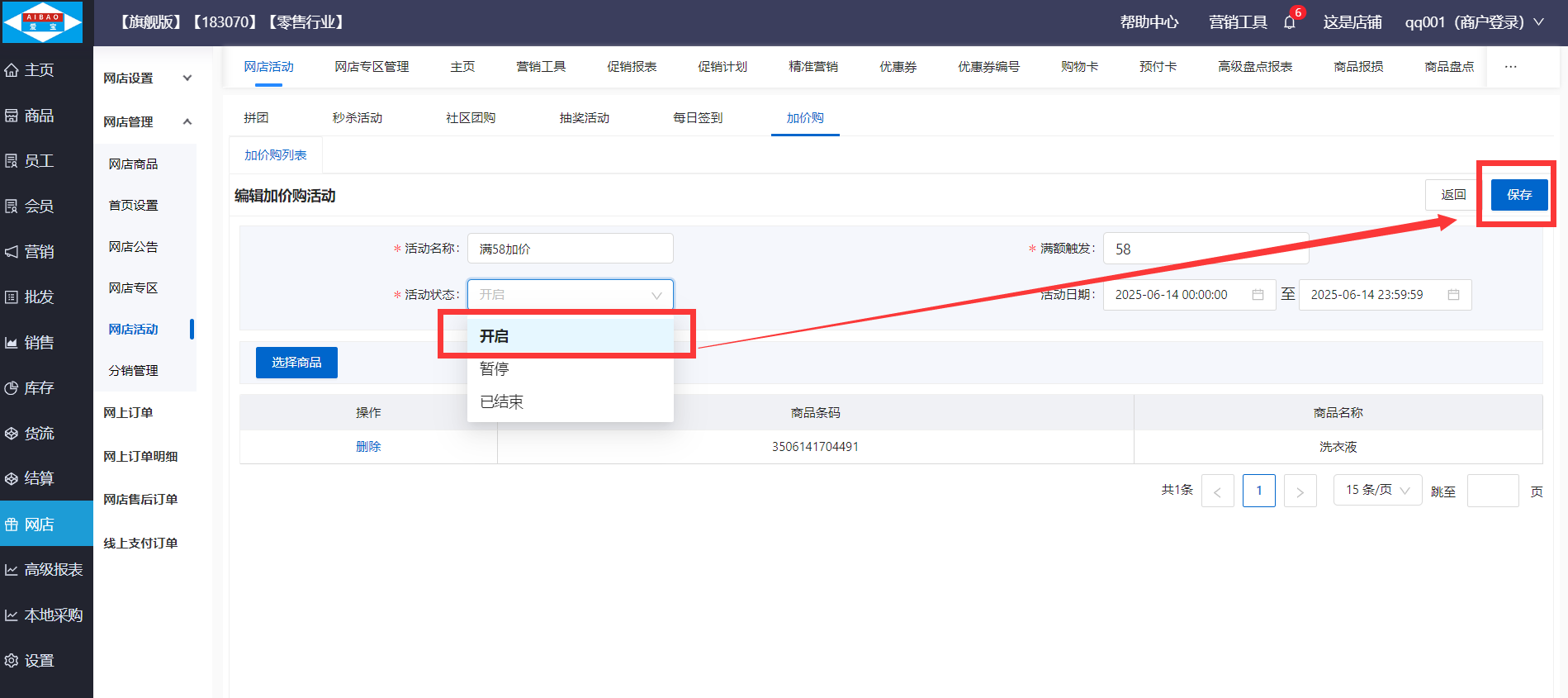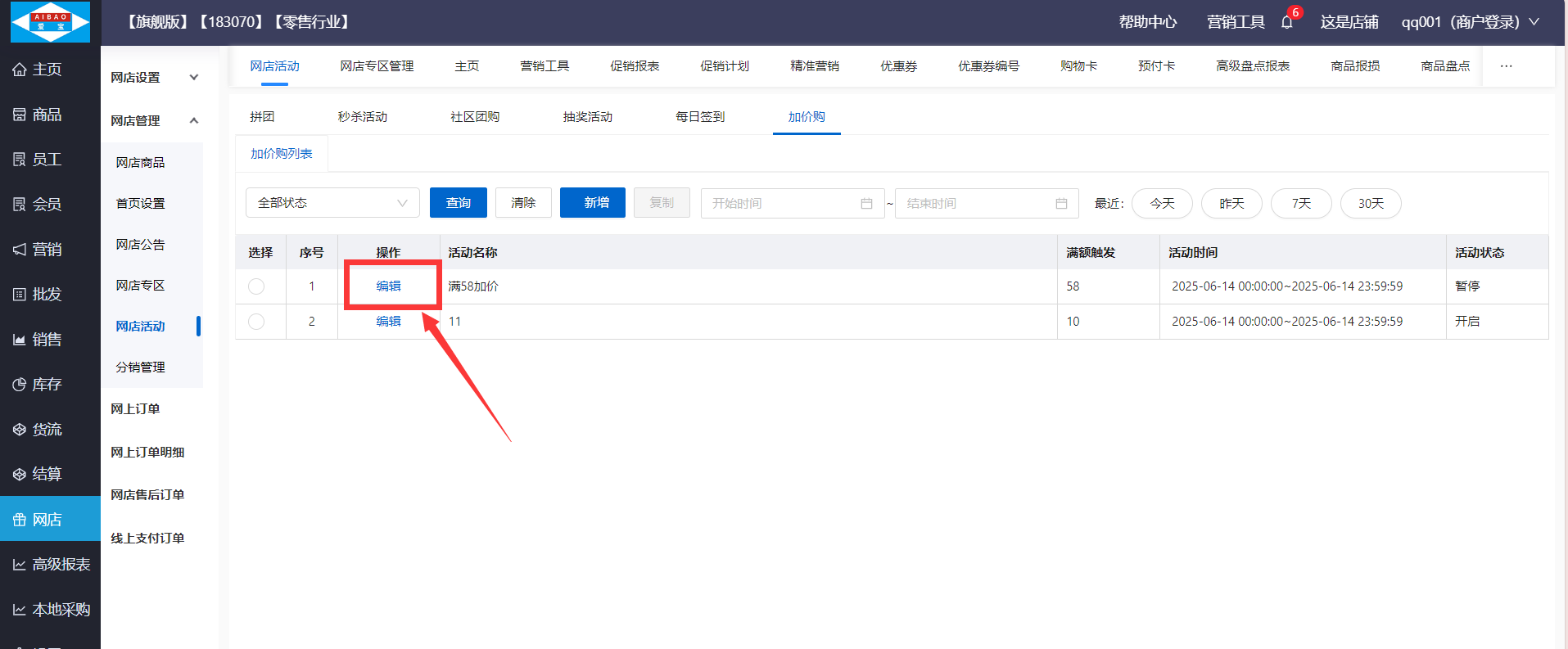 路径:【网店】-【网店管理】-【网店活动】-【加价购】