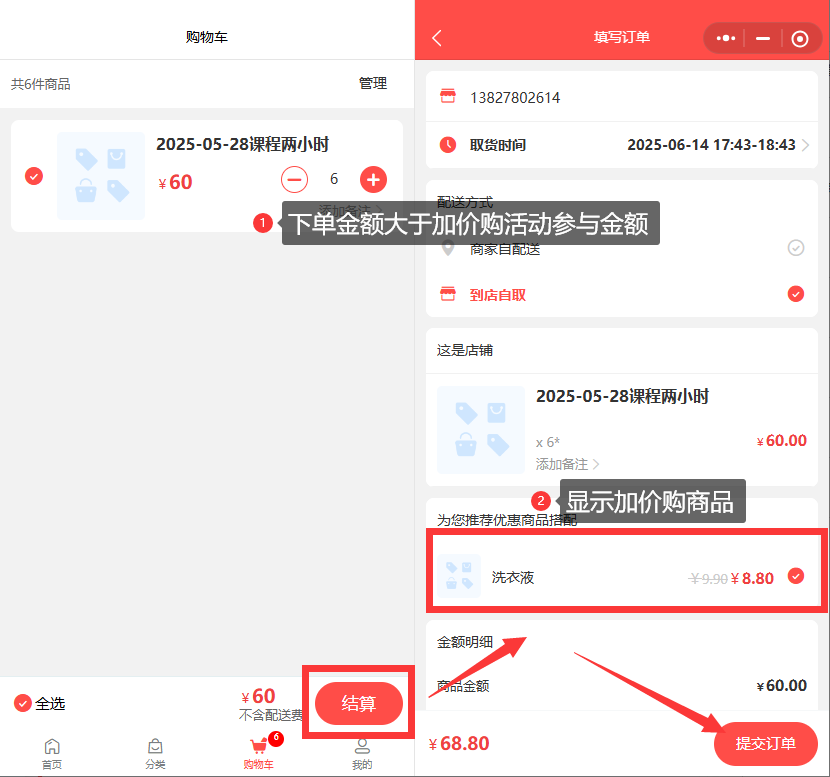 会员在小程序下单时,满足加价购活动的金额后,下单页面显示加价购商品,会员勾选即认为是购买