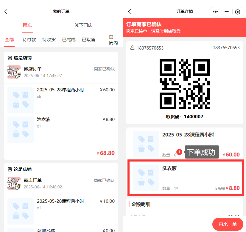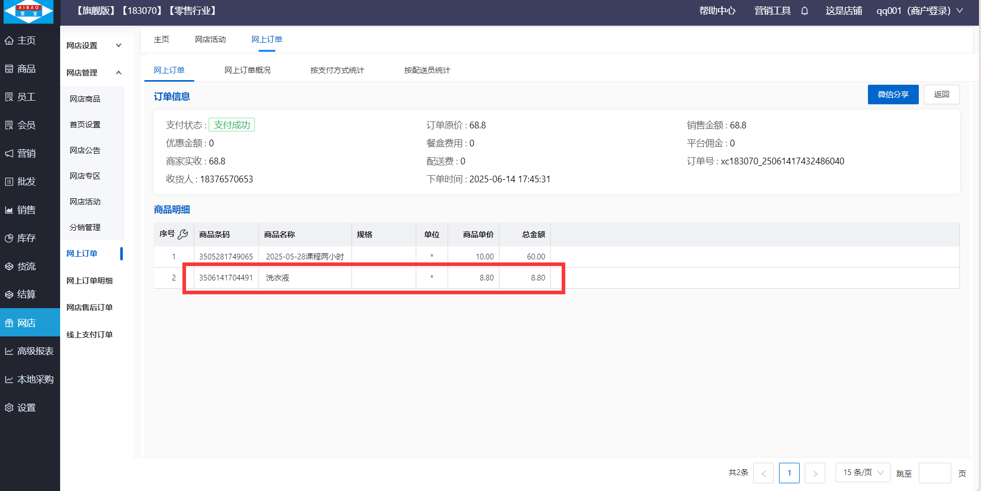 在网上订单页面,查看会员下单的订单