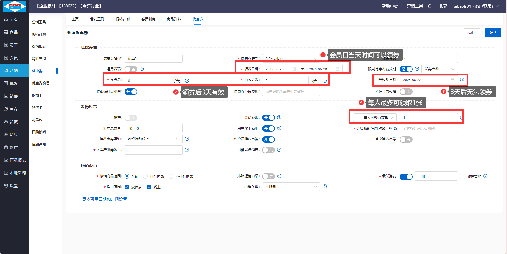 在会员节日当天发放优惠券,会员领取后当天生效、并在三天后过期,每人仅能领取1张