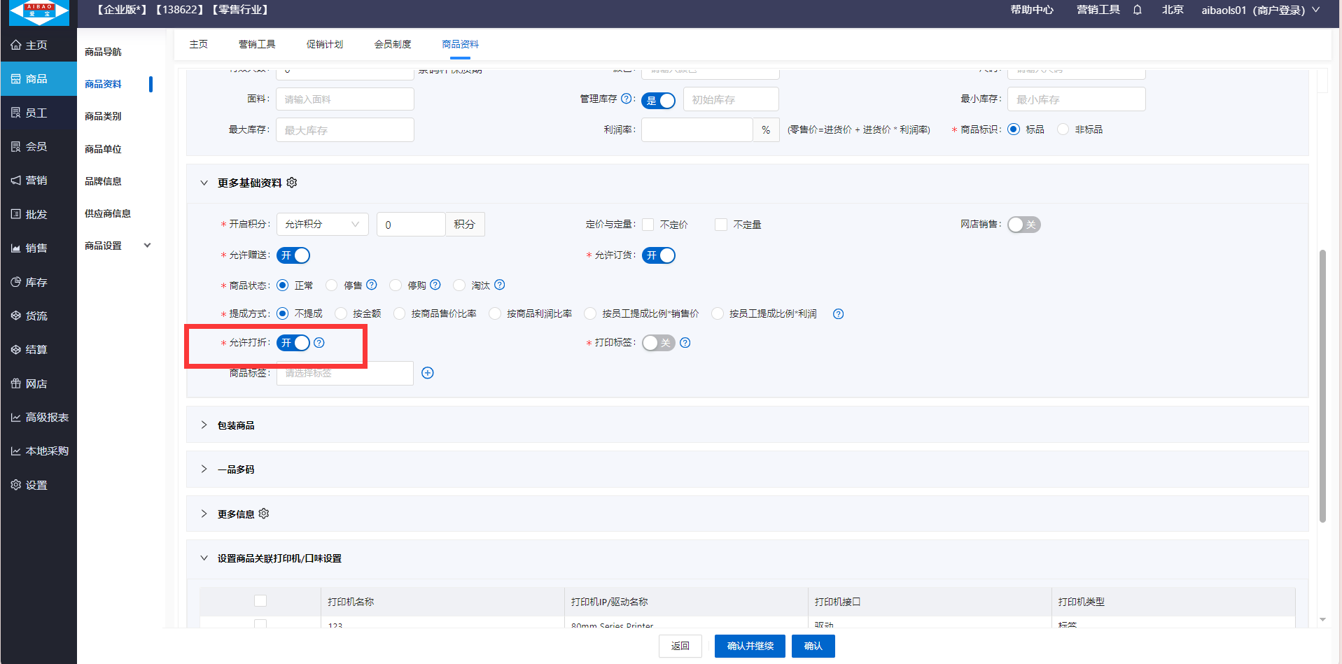 注:只有商品资料开启了允许打折的配置,才能参与全场折扣活动,若酒水饮料、槟榔、牛奶、冰淇淋等商品不参与折扣,需关闭该配置,不允许打折
