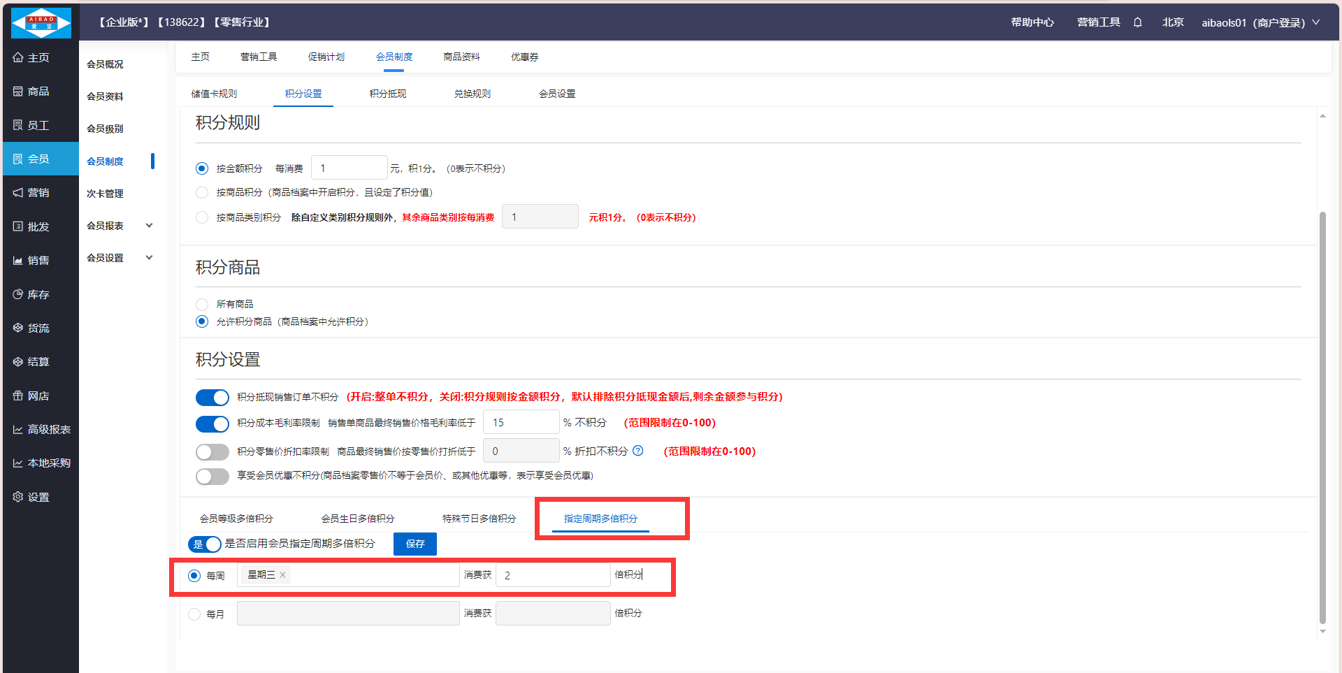 在会员日指定时间,会员消费获得多倍积分,如下图设置为:每周三会员消费获2倍积分