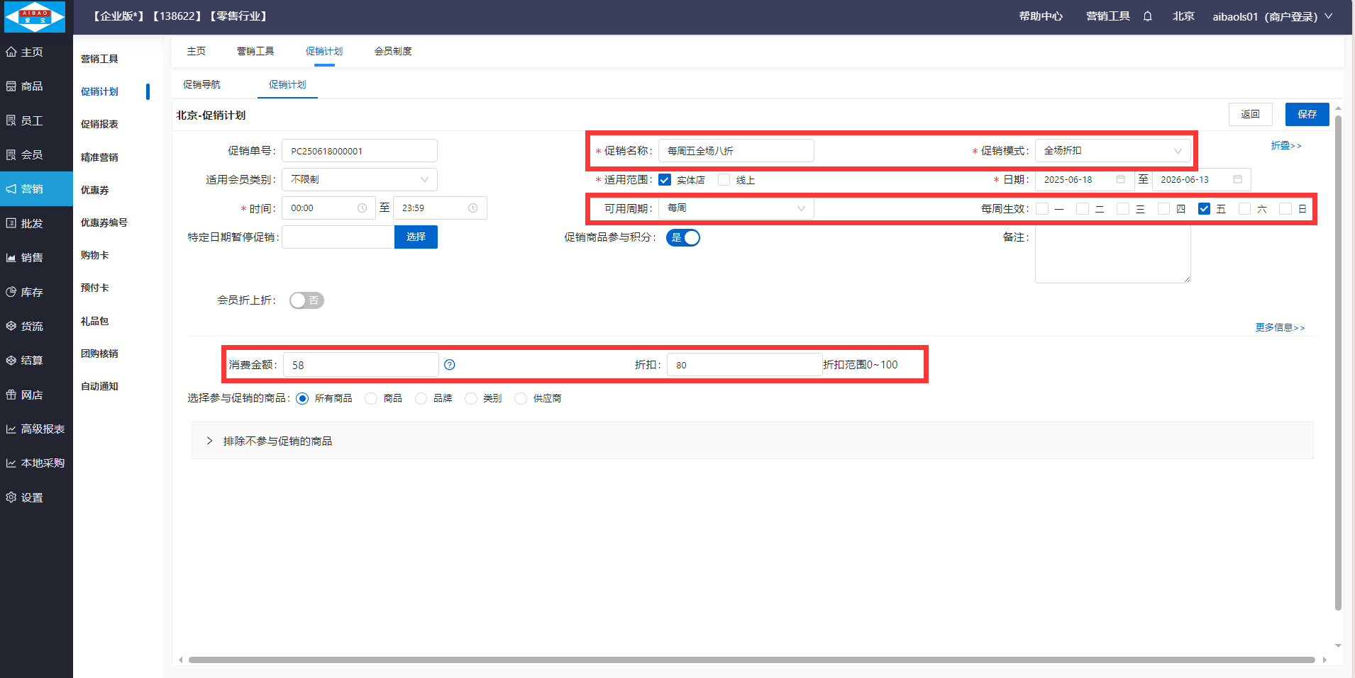 新建促销计划,促销模式为全场折扣,如下图设置的意思是:每周三消费满58元打八折优惠